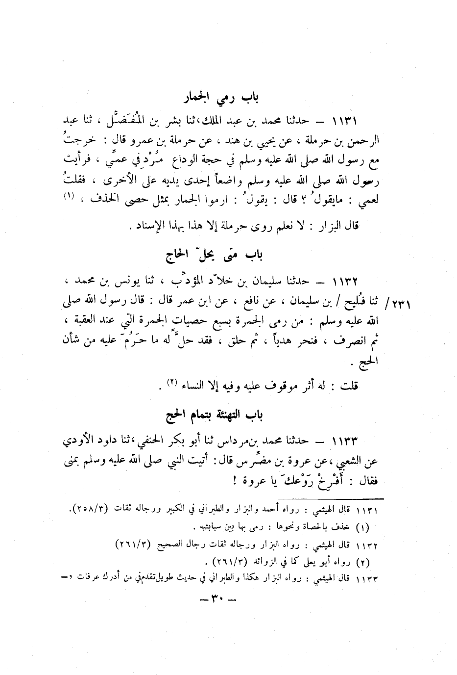 1131 - حَدَّثَنَا مُحَمَّدُ بْنُ عَبْدِ الْمَلِكِ، ثنا بِشْرُ بْنُ الْمُفَضَّلِ، ثنا عَبْدُ الرَّحْمَنِ بْنُ حَرْمَلَةَ، عَنْ يَحْيَى بْنِ هِنْدٍ، عَنْ حَرْمَلَةَ بْنِ عَمْرٍو، قَالَ: خَرَجْتُ مَعَ رَسُولِ اللَّهِ صَلَّى اللَّهُ عَلَيْهِ وَسَلَّمَ فِي حَجَّةِ الْوَدَاعِ مُرْدِفِي عَمِّي، فَرَأَيْتُ رَسُولَ اللَّهِ صَلَّى اللَّهُ عَلَيْهِ وَسَلَّمَ وَاضِعًا إِحْدَى يَدَيْهِ عَلَى الأُخْرَى، فَقُلْت لِعَمِّي: مَا يَقُولُ؟ قَالَ: يَقُولُ: ارْمُوا الْجِمَارَ بِمِثْلِ حَصَى الْخَذْفِ.