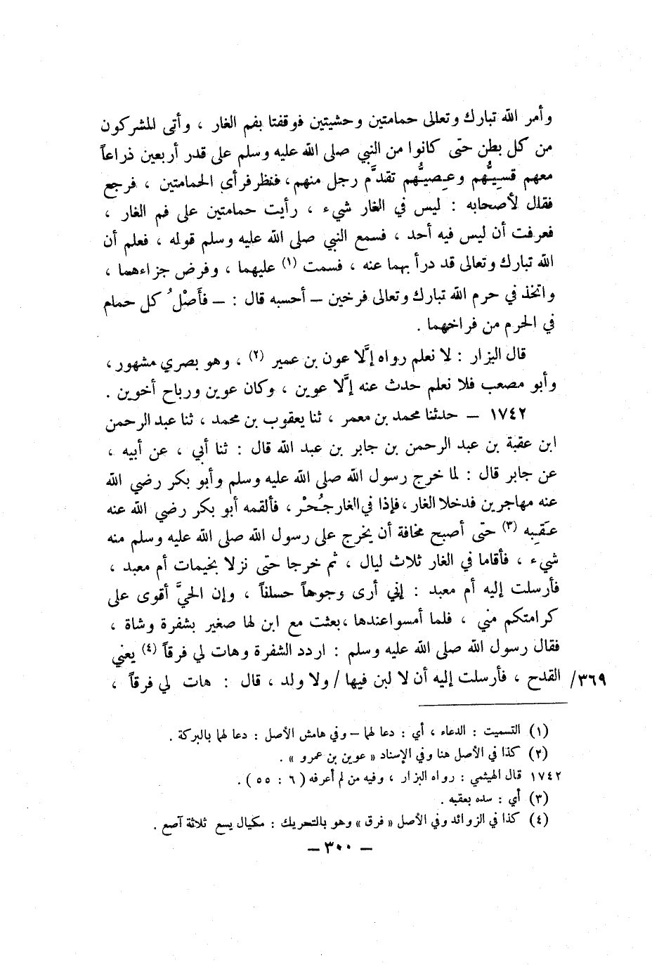 1742 - حَدَّثَنَا مُحَمَّدُ بْنُ مَعْمَرٍ، ثنا يَعْقُوبُ بْنُ مُحَمَّدٍ، ثنا عَبْدُ الرَّحْمَنِ بْنُ عُقْبَةَ بْنِ عَبْدِ الرَّحْمَنِ بْنِ جَابِرِ بْنِ عَبْدِ اللَّهِ، قَالَ: ثنا أَبِي، عَنْ أَبِيهِ، عَنْ جَابِرٍ، قَالَ: لَمَّا خَرَجَ رَسُولُ اللَّهِ صَلَّى اللَّهُ عَلَيْهِ وَسَلَّمَ وَأَبُو بَكْرٍ رَضِيَ اللَّهُ عَنْهُ مُهَاجِرِينَ فَدَخَلا الْغَارَ، فَإِذَا فِي الْغَارِ جُحْرٌ، فَأَلْقَمَهُ أَبُو بَكْرٍ رَضِيَ اللَّهُ عَنْهُ عَقِبَهُ حَتَّى أَصْبَحَ مَخَافَةَ أَنْ يَخْرُجَ عَلَى رَسُولِ اللَّهِ صَلَّى اللَّهُ عَلَيْهِ وَسَلَّمَ مِنْهُ شَيْءٌ، فَأَقَامَا فِي الْغَارِ ثَلاثَ لَيَالٍ، ثُمَّ خَرَجَا حَتَّى نَزَلا بِخَيْمَاتِ أُمِّ مَعْبَدٍ، فَأْرَسَلَتْ إِلَيْهِ أُمُّ مَعْبَدٍ: إِنِّي أَرَى وُجُوهًا حِسَانًا، وَإِنَّ الْحَيَّ أَقْوَى عَلَى كَرَامَتِكُمْ مِنِّي، فَلَمَّا أَمْسَوْا عِنْدَهَا، بَعَثَتْ مَعَ ابْنٍ لَهَا صَغِيرٍ بِشَفْرَةٍ وَشَاةٍ، فَقَالَ رَسُولُ اللَّهِ صَلَّى اللَّهُ عَلَيْهِ وَسَلَّمَ: " ارْدُدِ الشَّفْرَةَ وَهَاتِ لِي فَرَقًا، يَعْنِي: الْقَدَحَ "، فَأَرَسَلَتْ إِلَيْهِ أَنْ لا لَبَنَ فِيهَا وَلا وَلَدَ، قَالَ: «هَاتِ لِي فَرَقًا» ،