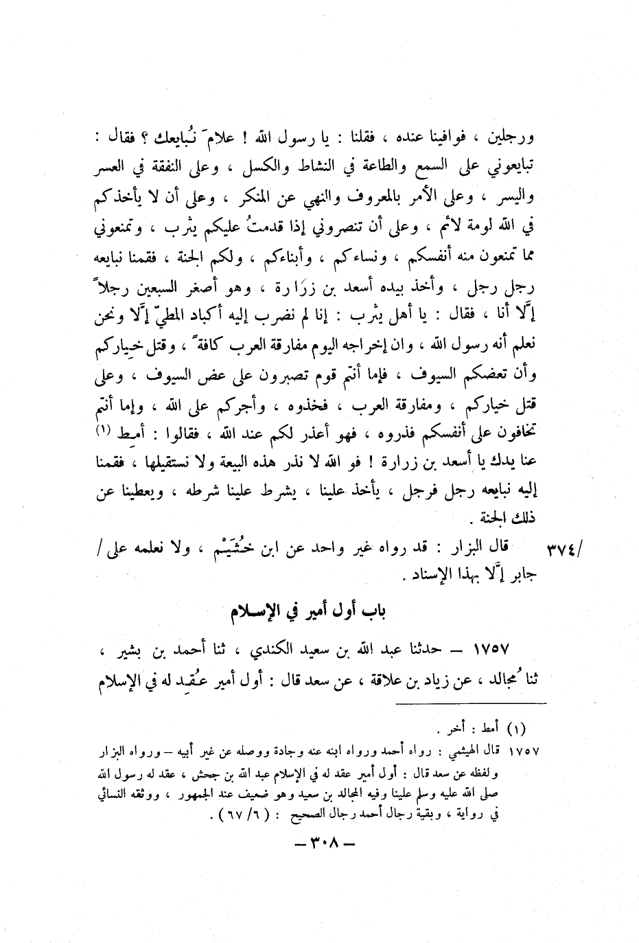 وَرَجُلَيْنِ، فَوَافَيْنَا عِنْدَهُ، فَقُلْنَا: يَا رَسُولَ اللَّهِ، عَلامَ نُبَايِعُكَ؟ فَقَالَ: «تُبَايِعُونِي عَلَى السَّمْعِ وَالطَّاعَةِ فِي النَّشَاطِ وَالْكَسَلِ، وَعَلَى النَّفَقَةِ فِي الْعُسْرِ وَالْيُسْرِ، وَعَلَى الأَمْرِ بِالْمَعْرُوفِ وَالنَّهْيِ عَنِ الْمُنْكَرِ، وَعَلَى أَنْ لا يَأْخُذَكُمْ فِي اللَّهِ لَوْمَةَ لائِمٍ، وَعَلَى أَنْ تَنْصُرُونِي إِذَا قَدِمْتُ عَلَيْكُمْ يَثْرِبَ، وَتَمْنَعُونِي مِمَّا تَمْنَعُونَ مِنْهُ أَنْفُسَكُمْ، وَنِسَاءَكُمْ، وَأَبْنَاءَكُمْ، وَلَكُمُ الْجَنَّةُ» ، فَقُمْنَا نُبَايِعُهُ رَجُلٌ رَجُلٌ، وَأَخَذَ بِيَدِهِ أَسْعَدُ بْنُ زُرَارَةَ، وَهُوَ أَصْغَرُ السَّبْعِينَ رَجُلا إِلا أَنَا، فَقَالَ: يَا أَهْلَ يَثْرِبَ، إِنَّا لَمْ نَضْرِبْ إِلَيْهِ أَكْبَادَ الْمَطِيِّ إِلا وَنَحْنُ نَعْلَمُ أَنَّهُ رَسُولُ اللَّهِ، وَأَنَّ إِخْرَاجَهُ الْيَوْمَ مُفَارَقَةُ الْعَرَبِ كَافَّةً، وَقَتْلُ خِيَارِكُمْ وَأَنْ تَعَضَّكُمُ السُّيُوفُ، فَإِمَّا أَنْتُمْ قَوْمٌ تَصْبِرُونَ عَلَى عَضِّ السُّيُوفِ، وَعَلَى قَتْلِ خِيَارِكُمْ، وَمُفَارَقَةِ الْعَرَبِ، فَخُذُوهُ، وَأَجْرُكُمْ عَلَى اللَّهِ، وَإِمَّا أَنْتُمْ تَخَافُونَ عَلَى أَنْفُسِكُمْ فَذَرُوهُ، فَهُوَ أَعْذَرُ لَكُمْ عِنْدَ اللَّهِ، فَقَالُوا: أَمِطْ عَنَّا يَدَكَ يَا أَسْعَدَ بْنِ زُرَارَةَ، فَوَاللَّهِ لا نَذَرُ هَذِهِ الْبَيْعَةَ وَلا نَسْتَقِيلُهَا، فَقُمْنَا إِلَيْهِ نُبَايِعُهُ رَجُلٌ فَرَجُلٌ، يَأْخُذُ عَلَيْنَا، يَشْرُطُ عَلَيْنَا شَرْطَهُ، وَيُعْطِينَا عَنْ ذَلِكَ الْجَنَّةَ.