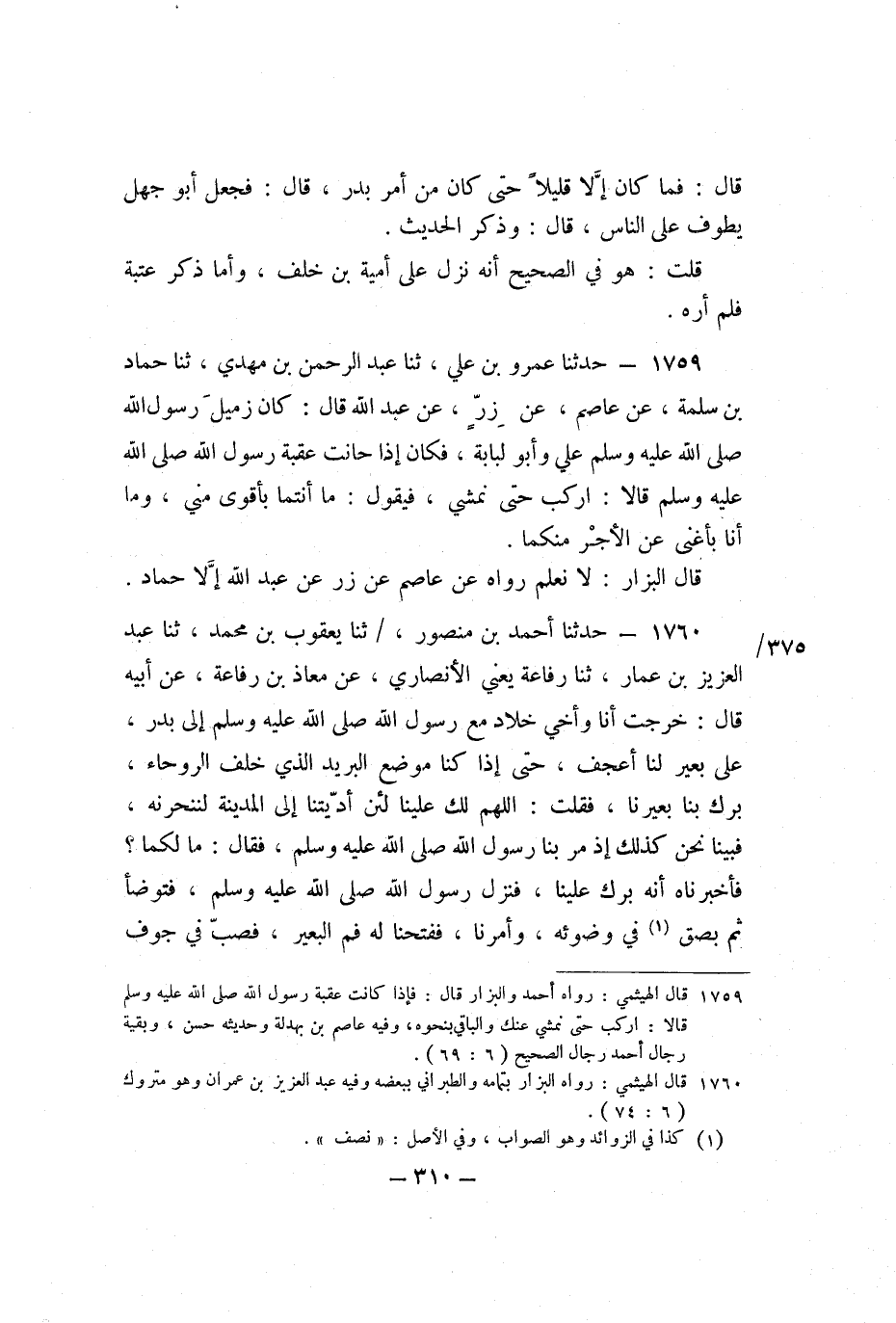 1759 - حَدَّثَنَا عَمْرُو بْنُ عَلِيٍّ، ثنا عَبْدُ الرَّحْمَنِ بْنُ مَهْدِيٍّ، ثنا حَمَّادُ بْنُ سَلَمَةَ، عَنْ عَاصِمٍ، عَنْ زَرٍّ، عَنْ عَبْدِ اللَّهِ قَالَ: كَانَ زَمِيلَ رَسُولِ اللَّهِ صَلَّى اللَّهُ عَلَيْهِ وَسَلَّمَ عَلِيٌّ وَأَبُو لُبَابَةَ، فَكَانَ إِذا حَانَتْ عَقَبَةُ رَسُولِ اللَّهِ صَلَّى اللَّهُ عَلَيْهِ وَسَلَّمَ قَالا: ارْكَبْ حَتَّى نَمْشِيَ، فَيَقُولُ: مَا أَنْتُمَا بِأَقْوَى مِنِّي، وَمَا أَنَا بِأَغْنَى عَنِ الأَجْرِ مِنْكُمَا.