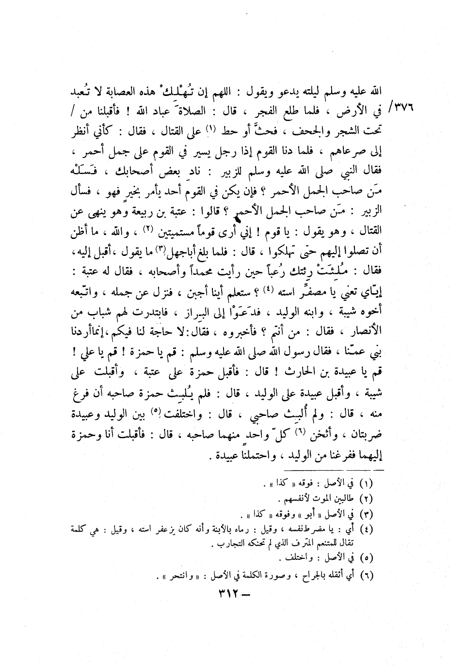 اللَّهُ عَلَيْهِ وَسَلَّمَ لَيْلَتَهُ يَدْعُو، وَيَقُولُ: «اللَّهُمَّ إِنْ تُهْلِكَ هَذِهِ الْعُصَابَةَ لا تُعْبَدُ فِي الأَرْضِ» ، فَلَمَّا طَلَعَ الْفَجْرُ، قَالَ: «الصَّلاةَ عِبَادَ اللَّهِ» ، فَأَقْبَلْنَا مِنْ تَحْتِ الشَّجَرِ وَالْجَحَفِ، فَحَثَّ أَوْ حَطَّ عَلَى الْقِتَالِ، فَقَالَ: كَأَنِّي أَنْظُرُ إِلَى صَرْعَاهُمْ، فَلَمَّا دَنَا الْقَوْمُ إِذَا رَجُلٌ يَسِيرُ فِي الْقَوْمِ عَلَى جَمَلٍ أَحْمَرَ، فَقَالَ النَّبِيُّ صَلَّى اللَّهُ عَلَيْهِ وَسَلَّمَ لِلزُّبَيْرِ: «نَادِ بَعْضَ أَصْحَابِكَ، فَسَلْهُ مَنْ صَاحِبُ الْجَمَلِ الأْحَمْرِ؟ فَإِنْ يَكُنْ فِي الْقَوْمِ أَحَدٌ يَأْمُرُ بِخَيْرٍ فَهُوَ» ، فَسَأَلَ الزُّبَيْرُ: مَنْ صَاحِبُ الْجَمَلِ الأَحْمَرِ؟ قَالُوا: عُتْبَةُ بْنُ رَبِيعَةَ، وَهُوَ يَنْهَى عَنِ الْقِتَالِ، وَهُوَ يَقُولُ: يَا قَوْمُ، إِنِّي أَرَى قَوْمًا مُسْتَمِيتِينَ، وَاللَّهِ مَا أَظُنُّ أَنْ تَصِلُوا إِلَيْهِمْ حَتَّى تَهْلِكُوا، قَالَ: فَلَمَّا بَلَغَ أَبَا جَهْلٍ مَا يَقُولُ أَقْبَلَ إِلَيْهِ، فَقَالَ: مُلِئَتْ رِئَتُكَ رُعْبًا حِينَ رَأَيْتَ مُحَمَّدًا وَأَصْحَابَهُ، فَقَالَ لَهُ عُتْبَةُ: إِيَّايَ تَعْنِي يَا مُصَفَّرَ اسْتِهِ؟ سَتَعْلَمُ أَيُّنَا أَجْبَنُ، فَنَزَلَ عَنْ جَمَلِهِ، وَاتَّبَعَهُ أَخُوهُ شَيْبَةُ، وَابْنُهُ الْوَلِيدُ، فَدَعَوْا إِلَى الْبَرَازِ، فَابْتَدَرَتْ لَهُمْ شَبَابٌ مِنَ الأَنْصَارِ، فَقَالَ: مَنْ أَنْتُمْ؟ فَأَخْبَرُوهُ، فَقَالَ: لا حَاجَةَ لَنَا فِيكُمْ، إِنَّمَا أَرَدْنَا بَنِي عَمِّنَا، فَقَالَ رَسُولُ اللَّهِ صَلَّى اللَّهُ عَلَيْهِ وَسَلَّمَ: «قُمْ يَا حَمْزَةُ، قُمْ يَا عَلِيُّ، قُمْ يَا عُبَيْدَةُ بْنَ الْحَارِثِ» ، قَالَ: فَأَقْبَلَ حَمْزَةُ عَلَى عُتْبَةَ، وَأَقْبَلْتُ عَلَى شَيْبَةَ، وَأَقْبَلَ عُبَيْدَةُ عَلَى الْوَلِيدِ، قَالَ: فَلَمْ يَلْبَثْ حَمْزَة صَاحِبه أَنْ فَرَغَ مِنْهُ، قَالَ: وَلَمْ أَلْبَثْ صَاحِبِي، قَالَ: وَاخْتَلَفَتْ بَيْنَ الْوَلِيدِ وَعُبَيْدَةَ ضَرْبَتَانِ، وَأَثْخَنَ كُلُّ وَاحِدٍ مِنْهُمَا صَاحِبَهُ، قَالَ: فَأَقْبَلْتُ أَنَا وَحَمْزَةُ إِلَيْهِمَا فَفَرَغْنَا مِنَ الْوَلِيدِ، وَاحْتَمَلْنَا عُبَيْدَة.