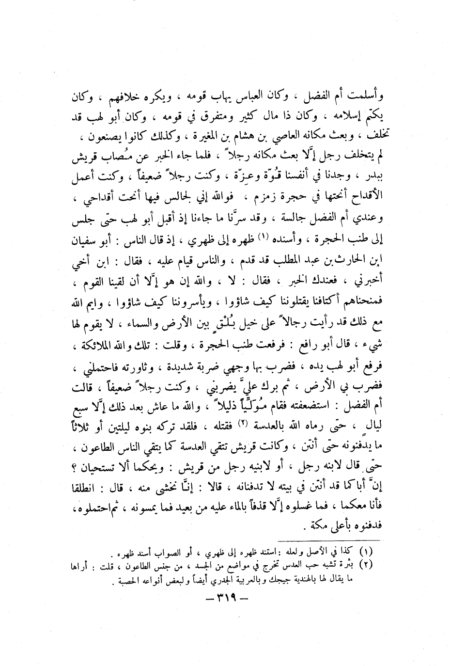 وَأَسْلَمَتْ أُمُّ الْفَضْلِ، وَكَانَ الْعَبَّاسُ يَهَابُ قَوْمَهُ، وَيَكْرَهُ خِلافَهُمْ، وَكَانَ يَكْتُمُ إِسْلامَهُ، وَكَانَ ذَا مَالٍ كَثِيرٍ وَمُتَفَرِّقٍ فِي قَوْمِهِ، وَكَانَ أَبُو لَهَبٍ قَدْ تَخَلَّفَ، وَبَعَثَ مَكَانَهُ الْعَاصِيَ بْنَ هِشَامِ بْنِ الْمُغِيرَةِ، وَكَذَلِكَ كَانُوا يَصْنَعُونَ، لَمْ يَتَخَلَّفْ رَجُلٌ إِلا بَعَثَ مَكَانَهُ رَجُلا، فَلَمَّا جَاءَ الْخَبَرُ عَنْ مُصَابِ قُرَيْشٍ بِبَدْرٍ، وَجَدْنَا فِي أَنْفُسِنَا قُوَّةً وَعِزَّةً، وَكُنْتُ رَجُلا ضَعِيفًا، وَكُنْتُ أَعْمَلُ الأَقْدَاحَ أَنْحِتُهَا فِي حُجْرَةِ زَمْزَمَ، فَوَاللَّهِ إِنِّي لَجَالِسٌ فِيهَا أَنْحِتُ أَقْدَاحِي، وَعِنْدِي أُمُّ الْفَضْلِ جَالِسَةٌ، وَقَدْ سِرْنَا مَا جَاءَنَا إِذْ أَقْبَلَ أَبُو لَهَبٍ حَتَّى جَلَسَ إِلَى طُنْبِ الْحُجْرَةِ، وَأَسْنَدَ ظَهْرَهُ إِلَى ظَهْرِي، إِذْ قَالَ النَّاسُ: أَبُو سُفْيَانَ بْنُ الْحَارِثِ بْنِ عَبْدِ الْمُطَّلِبِ قَدْ قَدِمَ، وَالنَّاسُ قِيَامٌ عَلَيْهِ، فَقَالَ: ابْنُ أَخِي أَخْبِرْنِي، فَعِنْدَكَ الْخَبَرُ، فَقَالَ: لا، وَاللَّهِ إِنْ هُوَ إِلا أَنْ لَقِينَا الْقَوْمَ، فَمَنَحْنَاهُمْ أَكْتَافَنَا يَقْتُلُونَنَا كَيْفَ شَاءُوا، وَيَأْسِرُونَنَا كَيْفَ شَاءُوا، وَايْمُ اللَّهِ مَعَ ذَلِكَ قَدْ رَأَيْتُ رِجَالا عَلَى خَيْلٍ بُلْقٍ بَيْنَ الأَرْضِ وَالسَّمَاءِ، لا يَقُومُ لَهَا شَيْءٍ، قَالَ أَبُو رَافِعٍ: فَرَفَعْتُ طُنْبَ الْحُجْرَةِ، وَقُلْتُ: تِلْكَ وَاللَّهِ الْمَلائِكَةُ، فَرَفَعَ أَبُو لَهَبٍ يَدَهُ، فَضَرَبَ بِهَا وَجْهِي ضَرْبَةً شَدِيدَةً، وَثَاوَرْتُهُ فَاحْتَمَلَنِي فَضَرَبَ بِي الأَرَض، ثُمَّ بَرَكَ عَلَيَّ يَضْرِبُنِي، وَكُنْتُ رَجُلا ضَعِيفًا، قَالَتْ أُمُّ الْفَضْلِ: اسْتَضْعَفْتُهُ فَقَامَ مُوَلِّيًا ذَلِيلا، وَاللَّهِ مَا عَاشَ بَعْدَ ذَلِكَ إِلا سَبْعَ لَيَالٍ، حَتَّى رَمَاهُ اللَّهُ بِالْعَدَسَةِ فَقَتَلَهُ، فَلَقَدْ تَرَكَهُ بَنُوهُ لَيْلَتَيْنِ أَوْ ثَلاثًا مَا يَدْفِنُونَهُ حَتَّى أُنْتِنَ، وَكَانَتْ قُرَيْشٌ تَتَّقِي الْعَدَسَةَ كَمَا يَتَّقِي النَّاسُ الطَّاعُونَ، حَتَّى قَالَ لابْنِهِ رَجُلٌ، أَوْ لابْنَيْهِ رَجُلٌ مِنْ قُرَيْشٍ: وَيْحَكُمَا أَلَا تَسْتَحِيَانِ؟ إِنَّ أَبَاكُمَا قَدْ أُنْتِنَ فِي بَيْتِهِ لا تَدْفِنَانِهِ، قَالا: إِنَّا نَخْشَى مِنْهُ، قَالَ: انْطَلِقَا فَأَنَا مَعَكُمَا، فَمَا غَسَّلُوهُ إِلا قَذْفًا بِالْمَاءِ عَلَيْهِ مِنْ بَعِيدٍ فَمَا يَمَسُّونَهُ، ثُمَّ احْتَمَلُوهُ فَدَفَنُوهُ بِأَعْلَى مَكَّةَ.