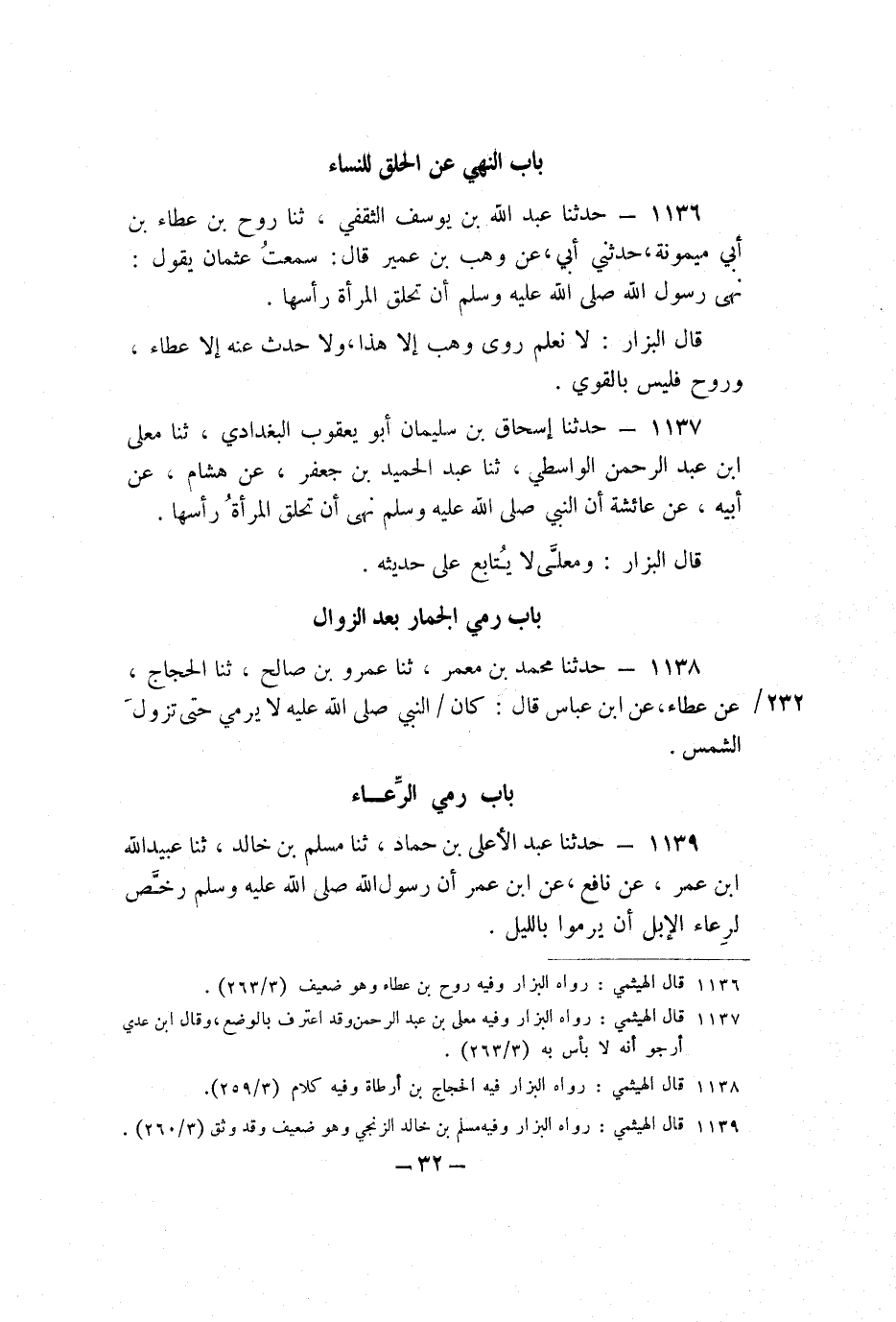 1136 - حَدَّثَنَا عَبْدُ اللَّهِ بْنُ يُوسُفَ الثَّقَفِيُّ، ثنا رَوْحُ بْنُ عَطَاءِ بْنِ أَبِي مَيْمُونَةَ، حَدَّثَنِي أَبِي، عَنْ وَهْبِ بْنِ عُمَيْرٍ، قَالَ: سَمِعْتُ عُثْمَانَ يَقُولُ: نَهَى رَسُولُ اللَّهِ صَلَّى اللَّهُ عَلَيْهِ وَسَلَّمَ أَنْ تَحْلِقَ الْمَرْأَةُ رَأْسَهَا.
