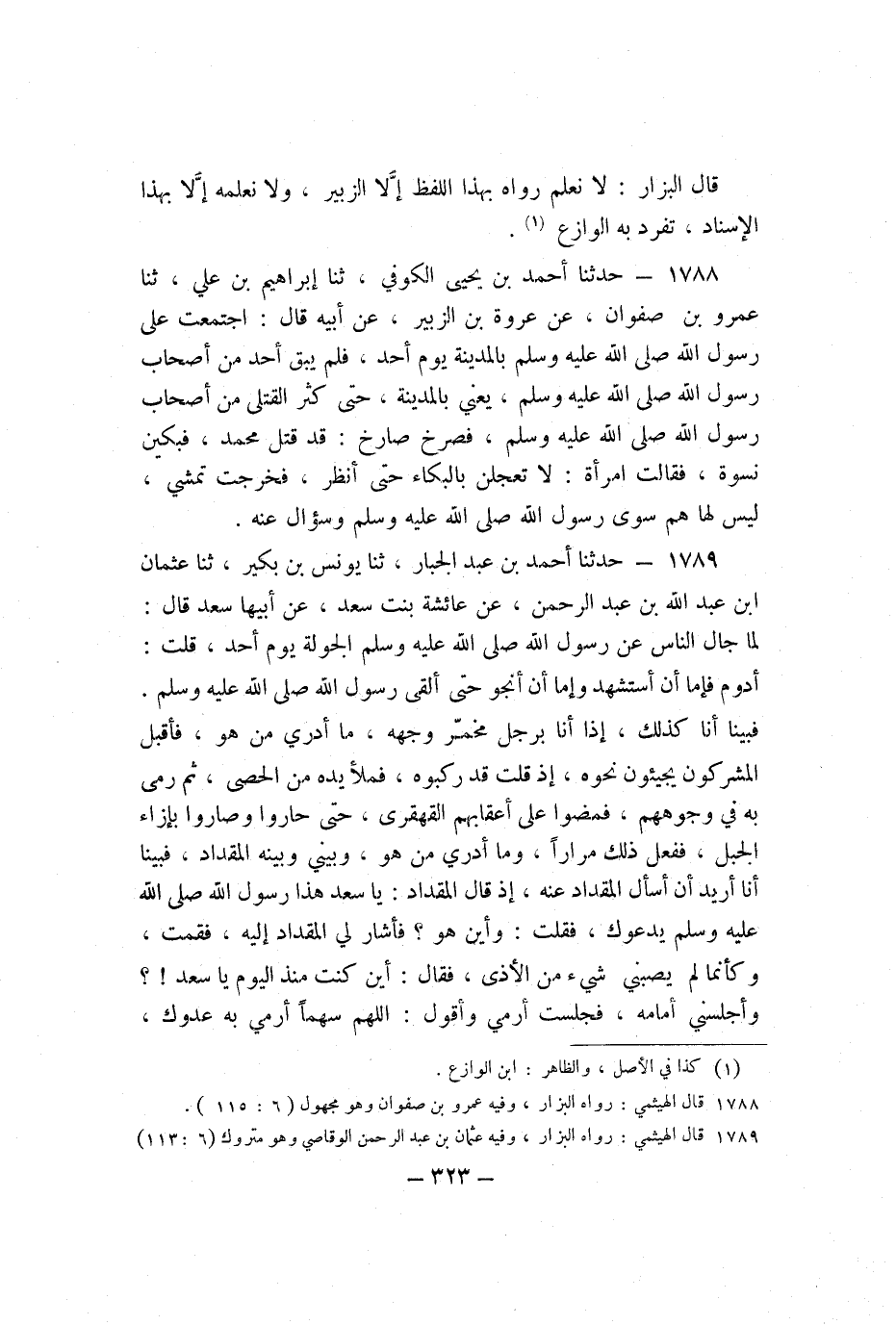 1788 - حَدَّثَنَا أَحْمَدُ بْنُ يَحْيَى الْكُوفِيُّ، ثنا إِبْرَاهِيمُ بْنُ عَلِيٍّ، ثنا عَمْرُو بْنُ صَفْوَانَ، عَنْ عُرْوَةَ بْنِ الزُّبَيْرِ، عَنْ أَبِيهِ، قَالَ: اجْتَمَعْتُ عَلَى رَسُولِ اللَّهِ صَلَّى اللَّهُ عَلَيْهِ وَسَلَّمَ بِالْمَدِينَةِ يَوْمَ أُحُدٍ، فَلَمْ يَبْقَ أَحَدٌ مِنْ أَصْحَابِ رَسُولِ اللَّهِ صَلَّى اللَّهُ عَلَيْهِ وَسَلَّمَ، يَعْنِي: بِالْمَدِينَةِ، حَتَّى كَثُرَ الْقَتْلَى مِنْ أَصْحَابِ رَسُولِ اللَّهِ صَلَّى اللَّهُ عَلَيْهِ وَسَلَّمَ، فَصَرَخَ صَارِخٌ، قَدْ قُتِلَ مُحَمَّدٌ، فَبَكَيْنَ نِسْوَةٌ، فَقَالَتِ امْرَأَةٌ: لا تَعْجَلَنَّ بِالْبُكَاءِ حَتَّى أَنْظُرَ، فَخَرَجَتْ تَمْشِي، لَيْسَ لَهَا هَمٌّ سِوَى رَسُولِ اللَّهِ صَلَّى اللَّهُ عَلَيْهِ وَسَلَّمَ وَسُؤَالٍ عَنْهُ.