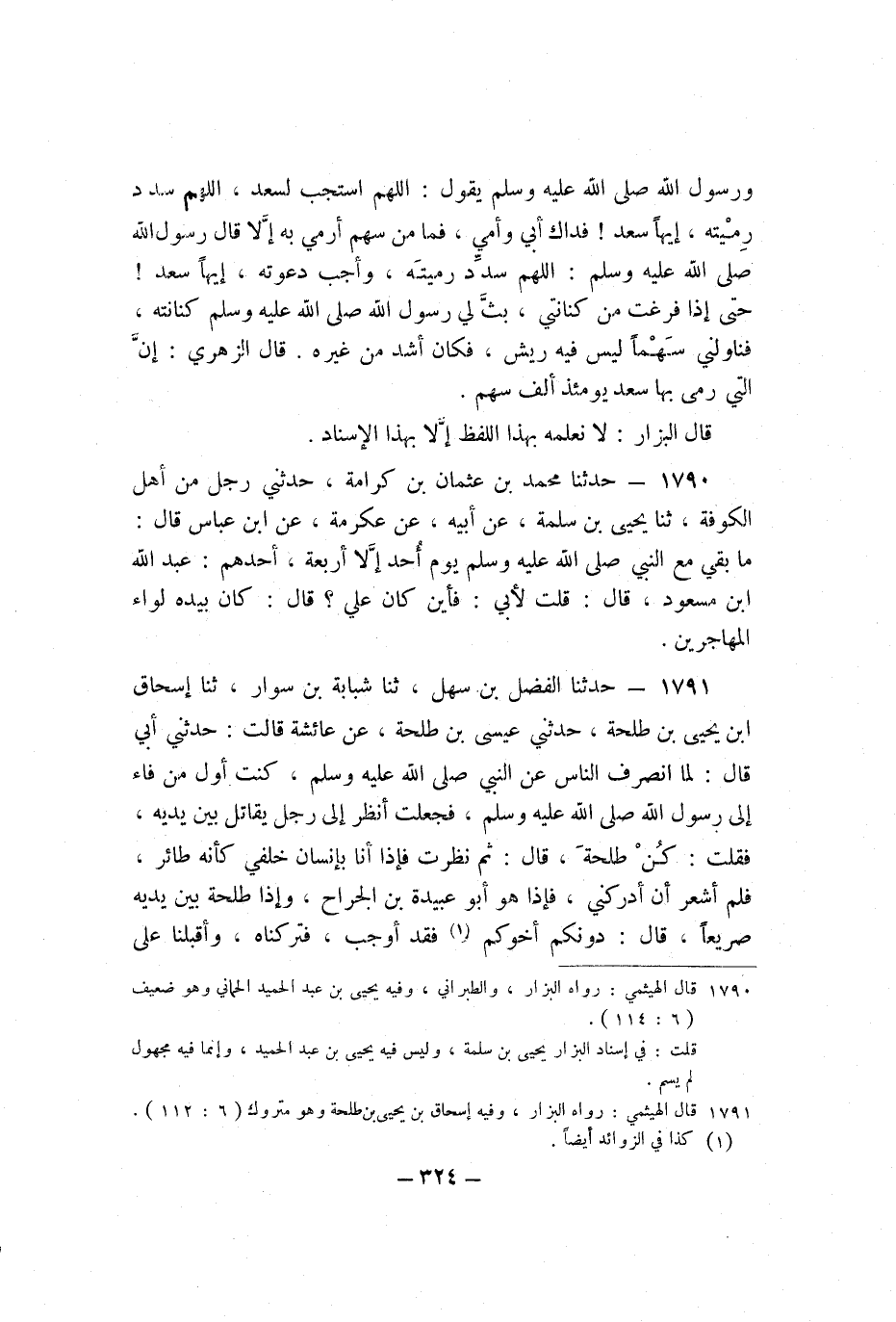 1791 - حَدَّثَنَا الْفَضْلُ بْنُ سَهْلٍ، ثنا شَبَابَةُ بْنُ سَوَّارٍ، ثنا إِسْحَاقُ بْنُ يَحْيَى بْنِ طَلْحَةَ، حَدَّثَنِي عِيسَى بْن طَلْحَةَ، عَنْ عَائِشَةَ قَالَتْ: حَدَّثَنِي أَبِي قَالَ: لَمَّا انْصَرَفَ النَّاسُ عَنِ النَّبِيِّ صَلَّى اللَّهُ عَلَيْهِ وَسَلَّمَ، كُنْتُ أَوَّلَ مَنْ فَاءَ إِلَى رَسُولِ اللَّهِ صَلَّى اللَّهُ عَلَيْهِ وَسَلَّمَ، فَجَعَلْتُ أَنْظُرُ إِلَى رَجُلٍ يُقَاتِلُ بَيْنَ يَدَيْهِ، فَقُلْتُ: كُنْ طَلْحَةَ، قَالَ: ثُمَّ نَظَرْتُ فَإِذَا أَنَا بِإِنْسَانٍ خَلْفِي كَأَنَّهُ طَائِرٌ، فَلَمْ أَشْعُرْ أَنْ أَدْرَكَنِي، فَإِذَا هُوَ أَبُو عُبَيْدَة بْنُ الْجَرَّاحِ، وَإِذَا طَلْحَةُ بَيْنَ يَدَيْهِ، صَرِيعًا، قَالَ: دُونَكُمْ أَخُوكُمْ فَقَدْ أَوْجَبَ، فَتَرَكْنَاهُ، وَأَقْبَلْنَا عَلَى