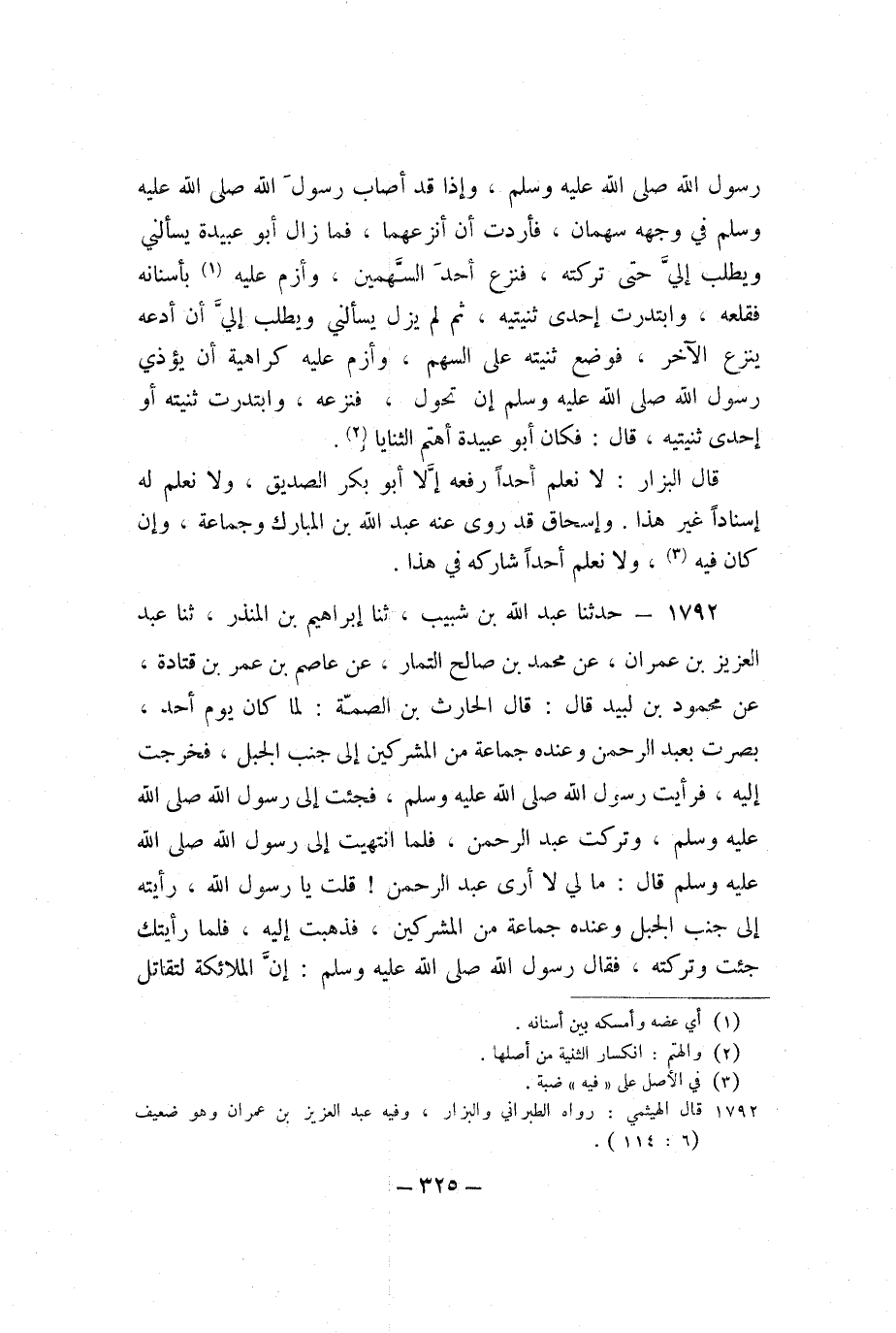 1792 - حَدَّثَنَا عَبْدُ اللَّهِ بْنُ شَبِيبٍ، ثنا إِبْرَاهِيمُ بْنُ الْمُنْذِرِ، ثنا عَبْدُ الْعَزِيرِ بْنُ عِمْرَانَ، عَنْ مُحَمَّدِ بْنِ صَالِحٍ التَّمَّارِ، عَنْ عَاصِمِ بْنِ عُمَرَ بْنِ قَتَادَةَ، عَنْ مَحْمُودِ بْنِ لَبِيدٍ، قَالَ: قَالَ الْحَارِثُ بْنُ الصِّمَّةِ: لَمَّا كَانَ يَوْمُ أُحُدٍ، بَصُرْتُ بِعَبْدِ الرَّحْمَنِ وَعِنْدَهُ جَمَاعَةٌ مِنَ الْمُشْرِكِينَ إِلَى جَنْبِ الْجَبَلِ، فَخَرَجْتُ إِلَيْهِ، فَرَأَيْتُ رَسُولَ اللَّهِ صَلَّى اللَّهُ عَلَيْهِ وَسَلَّمَ، فَجِئْتُ إِلَى رَسُولِ اللَّهِ صَلَّى اللَّهُ عَلَيْهِ وَسَلَّمَ، وَتَرَكْتُ عَبْدَ الرَّحْمَنِ، فَلَمَّا انْتَهَيْتُ إِلَى رَسُولِ اللَّهِ صَلَّى اللَّهُ عَلَيْهِ وَسَلَّمَ قَالَ: «مَا لِي لا أَرَى عَبْدَ الرَّحْمَنِ؟» قُلْتُ: يَا رَسُولَ اللَّهِ، رَأَيْتُهُ إِلَى جَنْبِ الْجَبَلِ وَعِنْدَهُ جَمَاعَةٌ مِنَ الْمُشْرِكِينَ، فَذَهَبْتُ إِلَيْهِ، فَلَمَّا رَأَيْتُكَ جِئْتُ وَتَرَكْتُهُ، فَقَالَ رَسُولُ اللَّهِ صَلَّى اللَّهُ عَلَيْهِ وَسَلَّمَ: «إِنَّ الْمَلائِكَةَ لَتُقَاتِلُ