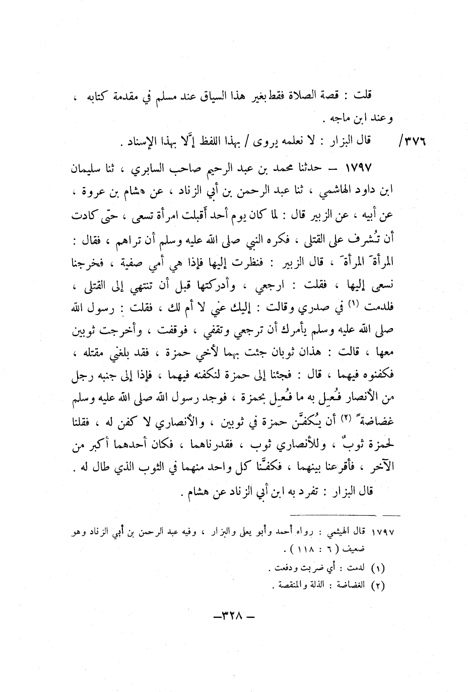 1797 - حَدَّثَنَا مُحَمَّدُ بْنُ عَبْد الرَّحِيمِ صَاحِبُ السَّابِرِيِّ، ثنا سُلَيْمَانُ بْنُ دَاوُدَ الْهَاشِمِيُّ، ثنا عَبْدُ الرَّحْمَنِ بْنُ أَبِي الزِّنَادِ، عَنْ هِشَامِ بْنِ عُرْوَةَ، عَنْ أَبِيهِ، عَنِ الزُّبَيْرِ، قَالَ: لَمَّا كَانَ يَوْمُ أُحُدٍ أَقْبَلَتِ امْرَأَةٌ تَسْعَى، حَتَّى كَادَتْ أَنْ تُشْرِفَ عَلَى الْقَتْلَى، فَكَرِهَ النَّبِيّ صَلَّى اللَّهُ عَلَيْهِ وَسَلَّمَ أَنْ تَرَاهُمْ، فَقَالَ: «الْمَرْأَةَ الْمَرْأَةَ» ، قَالَ الزُّبَيْرُ: فَنَظَرْتُ إِلَيْهَا فَإِذَا هِيَ أُمِّي صَفِيَّةُ، فَخَرَجْنَا نَسْعَى إِلَيْهَا، فَقُلْتُ: ارْجِعِي، وَأَدْرَكْتُهَا قَبْلَ أَنْ تَنْتَهِيَ إِلَى الْقَتْلَى، فَلَدَمَتْ فِي صَدْرِي، وَقَالَتْ: إِلَيْكَ عَنِّي لا أُمَّ لَكَ، فَقُلْتُ: رَسُولُ اللَّهِ صَلَّى اللَّهُ عَلَيْهِ وَسَلَّمَ يَأْمُرُكِ أَنْ تَرْجِعِي وَتَقِفِي، فَوَقَفَتْ، وَأَخْرَجَتْ ثَوْبَيْنِ مَعَهَا، قَالَتْ: هَذَانِ ثَوْبَانِ جِئْتُ بِهِمَا لأَخِي حَمْزَةَ، فَقَدْ بَلَغَنِي مَقْتَلُهُ، فَكَفَّنُوهُ فِيهِمَا، قَالَ: فَجِئْنَا إِلَى حَمْزَةَ لِنُكَفِّنُهُ فِيهِمَا، فَإِذَا إِلَى جَنْبَةِ رَجُلٌ مِنَ الأَنْصَارِ فُعِلَ بِهِ مَا فُعِلَ بِحَمْزَةَ، فَوَجَدَ رَسُولُ اللَّهِ صَلَّى اللَّهُ عَلَيْهِ وَسَلَّمَ غَضَاضَةً أَنْ يُكَفَّنَ حَمْزَةُ فِي ثَوْبَيْنِ، وَالأَنْصَارِيُّ لا كَفَنَ لَهُ، فَقُلْنَا: لِحَمْزَةَ ثَوْبٌ، وَلِلأَنْصَارِيِّ ثَوْبٌ، فَقَدَّرْنَاهُمَا، فَكَانَ أَحَدُهُمَا أَكْبَرَ مِنَ الآخَرِ، فَأَقْرَعْنَا بَيْنَهُمَا، فَكَفَّنَّا كُلَّ وَاحِدٍ مِنْهُمَا فِي الثَّوْبِ الَّذِي طَالَ لَهُ.