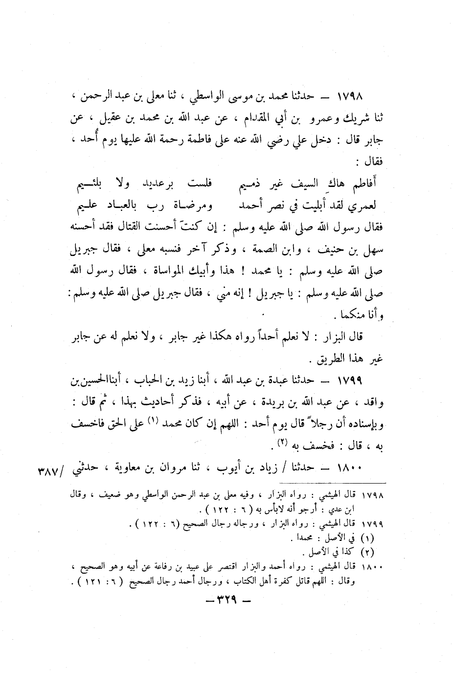 1798 - حَدَّثَنَا مُحَمَّدُ بْنُ مُوسَى الْوَاسِطِيُّ، ثنا مُعَلَّى بْنُ عَبْدِ الرَّحْمَنِ، ثنا شَرِيكٌ، وَعَمْرُو بْنُ أَبِي الْمِقْدَامِ، عَنْ عَبْدِ اللَّهِ بْنِ مُحَمَّدِ بْنِ عُقَيْلٍ، عَنْ جَابِرٍ، قَالَ: دَخَلَ عَلِيٌّ رَضِيَ اللَّهُ عَنْهُ عَلَى فَاطِمَةَ رَحْمَةُ اللَّهِ عَلَيْهَا يَوْمَ أُحُدٍ، فَقَالَ: