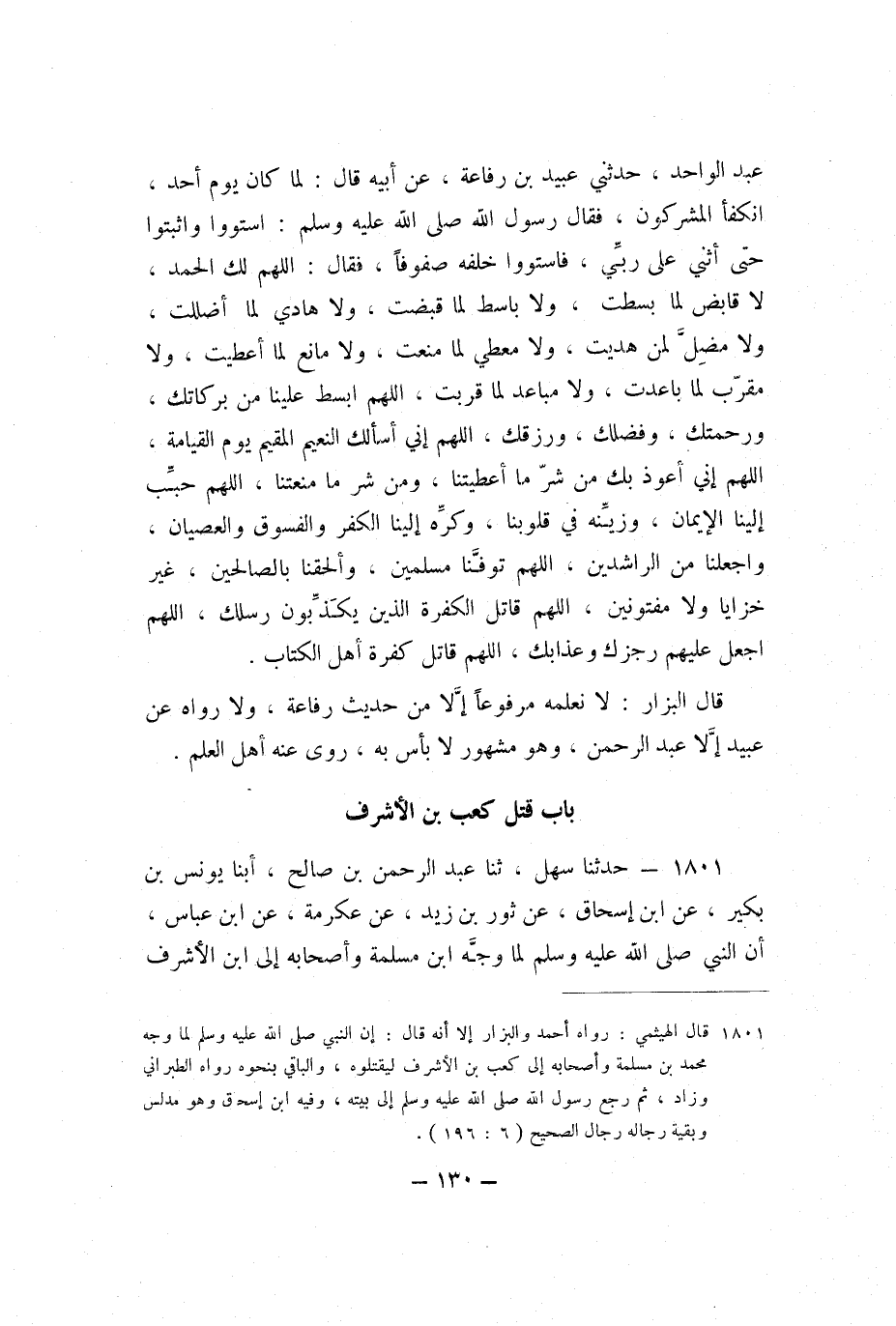 عَبْدُ الْوَاحِدِ، حَدَّثَنِي عُبَيْدُ بْنُ رِفَاعَةَ، عَنْ أَبِيهِ، قَالَ: لَمَّا كَانَ يَوْمُ أُحُدٍ، انْكَفَأَ الْمُشْرِكُونَ، فَقَالَ رَسُولُ اللَّهِ صَلَّى اللَّهُ عَلَيْهِ وَسَلَّمَ: «اسْتَوُوا وَاثْبُتُوا حَتَّى أُثْنِيَ عَلَى رَبِّي» ، فَاسْتَوَوْا خَلْفَهُ صُفُوفًا، فَقَالَ: «اللَّهُمَّ لَكَ الْحَمْدُ، لا قَابِضَ لِمَا بَسَطْتَ، وَلا بَاسِطَ لِمَا قَبَضْتَ، وَلا هَادِيَ لِمَا أَضْلَلْتَ، وَلا مُضِلَّ لِمَنْ هَدَيْتَ، وَلا مُعْطِيَ لِمَا مَنَعْتَ، وَلا مَانِعَ لِمَا أَعْطَيْتَ، وَلا مُقَرِّبَ لِمَا بَاعَدْتَ، وَلا مُبَاعِدَ لِمَا قَرَّبْتَ، اللَّهُمَّ ابْسِطْ عَلَيْنَا مِنْ بَرَكَاتِكَ، وَرَحْمَتِكَ، وَفَضْلِكَ، وَرِزْقِكَ، اللَّهُمَّ إِنِّي أَسْأَلُكَ النَّعِيمَ الْمُقِيمَ يَوْمَ الْقِيَامَةِ، اللَّهُمَّ إِنِّي أَعُوذُ بِكَ مِنْ شَرِّ مَا أَعْطَيْتَنَا، وَمِنْ شَرِّ مَا مَنَعْتَنَا، اللَّهُمَّ حَبِّبْ إِلَيْنَا الإِيمَانَ، وَزَيِّنْهُ فِي قُلُوبِنَا، وَكَرِّهْ إِلَيْنَا الْكُفْرَ وَالْفُسُوقَ وَالْعِصْيَانَ، وَاجْعَلْنَا مِنَ الرَّاشِدِينَ، اللَّهُمَّ تَوَفَّنَا مُسْلِمِينَ، وَأَلْحِقْنَا بِالصَّالِحِينَ، غَيْرَ خَزَايَا وَلا مَفْتُونِينَ، اللَّهُمَّ قَاتِلِ الْكَفَرَةَ الَّذِينَ يُكَذِّبُونَ رُسُلَكَ، اللَّهُمَّ اجْعَلْ عَلَيْهِمْ رِجْزَكَ وَعَذَابَكَ، اللَّهُمَّ قَاتِلْ كَفَرَةَ أَهْلِ الْكِتَابِ» .