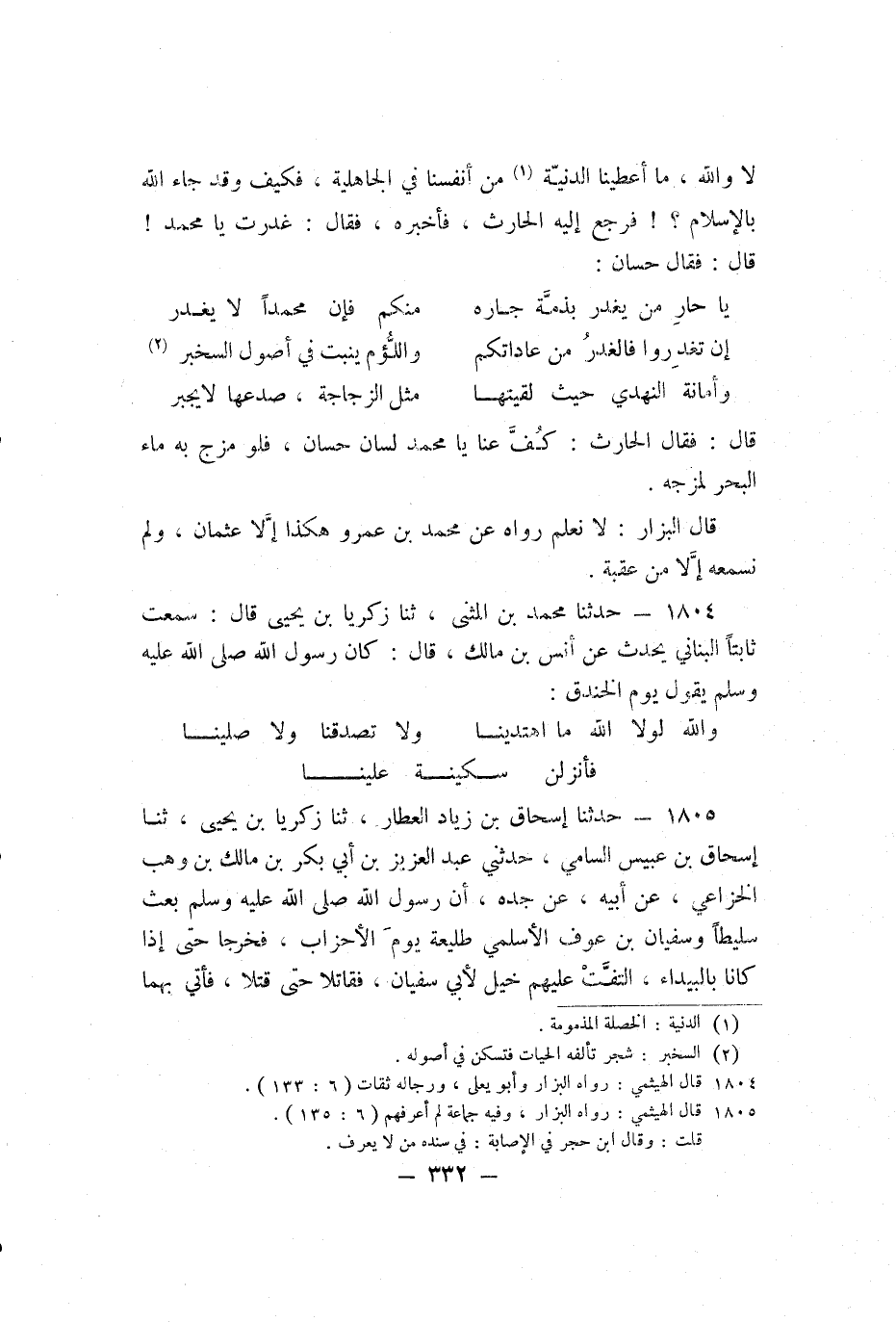لا وَاللَّهِ، مَا أَعْطَيْنَا الدَّنِيَّةَ مِنْ أَنْفُسِنَا فِي الْجَاهِلِيَّةِ، فَكَيْفَ وَقَدْ جَاءَ اللَّهُ بِالإِسْلامِ؟ ! فَرَجَعَ إِلَيْهِ الْحَارِثُ، فَأَخْبَرَهُ، فَقَالَ: غَدَرْتَ يَا مُحَمَّدُ، قَالَ: فَقَال حَسَّانٌ:
