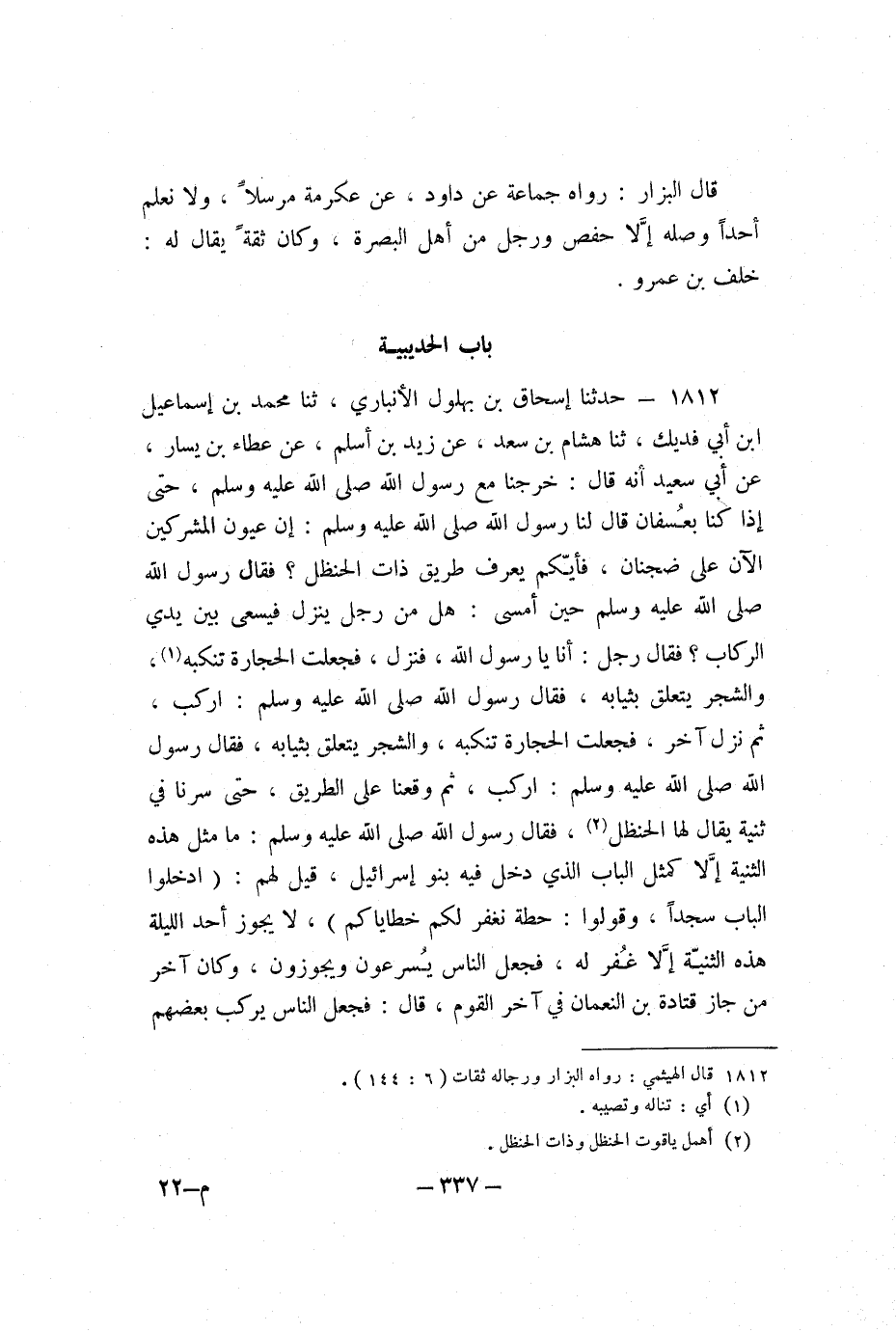 1812 - حَدَّثَنَا إِسْحَاقُ بْنُ بُهْلُولٍ الأَنْبَارِيُّ، ثنا مُحَمَّدُ بْنُ إِسْمَاعِيلَ ابْنِ أَبِي فُدَيْكٍ، ثنا هِشَامُ بْنُ سَعْدٍ، عَنْ زَيْدِ بْنِ أَسْلَمَ، عَنْ عَطَاءِ بْنِ يَسَارٍ، عَنْ أَبِي سَعِيدٍ، أَنَّهُ قَالَ: خَرَجْنَا مَعَ رَسُولِ اللَّهِ صَلَّى اللَّهُ عَلَيْهِ وَسَلَّمَ، حَتَّى إِذَا كُنَّا بِعُسْفَانَ قَالَ لَنَا رَسُولُ اللَّهِ صَلَّى اللَّهُ عَلَيْهِ وَسَلَّمَ: «إِنَّ عُيُونَ الْمُشْرِكِينَ الآنَ عَلَى ضَجْنَانَ، فَأَيُّكُمْ يَعْرِفُ طَرِيقَ ذَاتَ الْحَنْظَلِ؟» فَقَالَ رَسُولُ اللَّهِ صَلَّى اللَّهُ عَلَيْهِ وَسَلَّمَ حِينَ أَمْسَى: «هَلْ مِنْ رَجُلٍ يَنْزِلُ فَيَسْعَى بَيْنَ يَدَيِ الرِّكَابِ؟» فَقَالَ رَجُلٌ: أَنَا يَا رَسُولَ اللَّهِ، فَنَزَلَ، فَجَعَلَتِ الْحِجَارَةُ تَنْكُبُهُ، وَالشَّجَرُ يَتَعَلَّقُ بِثِيَابِهِ، فَقَالَ رَسُولُ اللَّهِ صَلَّى اللَّهُ عَلَيْهِ وَسَلَّمَ: «ارْكَبْ» ، ثُمَّ نَزَلَ آخَرُ، فَجَعَلَتِ الْحِجَارَةُ تَنْكُبُهُ، وَالشَّجَرُ يَتَعَلَّقُ بِثِيَابِهِ، فَقَالَ رَسُولُ اللَّهِ صَلَّى اللَّهُ عَلَيْهِ وَسَلَّمَ: «ارْكَبْ» ، ثُمَّ وَقَعْنَا عَلَى الطَّرِيقِ، حَتَّى سِرْنَا فِي ثَنِيَّةٍ يُقَالُ لَهَا: الْحَنْظَلُ، فَقَالَ رَسُولُ اللَّهِ صَلَّى اللَّهُ عَلَيْهِ وَسَلَّمَ: " مَا مِثْلُ هَذِهِ الثَّنِيَّةِ إِلا كَمَثَلِ الْبَابِ الَّذِي دَخَلَ فِيهِ بَنُو إِسْرَائِيلَ، قِيلَ لَهُمْ: {ادْخُلُوا الْبَابَ سُجَّدًا وَقُولُوا حِطَّةٌ نَغْفِرْ لَكُمْ خَطَايَاكُمْ} [البقرة: 58] ، لا يَجُوزُ أَحَدٌ اللَّيْلَةَ هَذِهِ الثَّنِيَّةَ إِلا غُفِرَ لَهُ، فَجَعَلَ النَّاسُ يُسْرِعُونَ وَيَجُوزُونَ، وَكَانَ آخِرُ مَنْ جَازَ قَتَادَةُ بْنُ النُّعْمَانِ فِي آخِرِ الْقَوْمِ، قَالَ: فَجَعَلَ النَّاسُ يَرْكَبُ بَعْضُهُمْ