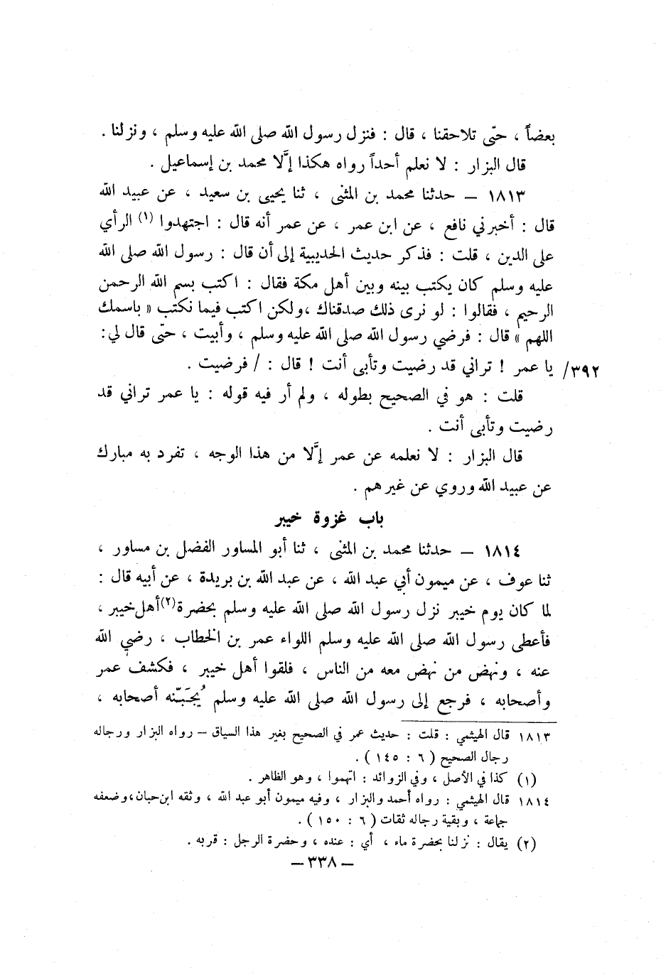 1813 - حَدَّثَنَا مُحَمَّدُ بْنُ الْمُثَنَّى، ثنا يَحْيَى بْنُ سَعِيدٍ، عَنْ عُبَيْدِ اللَّهِ، قَالَ: أَخْبَرَنِي نَافِعٌ، عَنِ ابْنِ عُمَرَ، عَنْ عُمَرَ أَنَّهُ قَالَ: اجْتَهِدُوا الرَّأْيَ عَلَى الدِّينِ، قُلْتُ: فَذَكَرَ حَدِيثَ الْحُدَيْبِيَةِ إِلَى أَنْ قَالَ: رَسُولُ اللَّهِ صَلَّى اللَّهُ عَلَيْهِ وَسَلَّمَ كَانَ يَكْتُبُ بَيْنَهُ وَبَيْنَ أَهْلِ مَكَّةَ فَقَالَ: «اكْتُبْ بِسْمِ اللَّهِ الرَّحْمَنِ الرَّحِيمِ،» فَقَالُوا: لَوْ نَرَى ذَلِكَ صَدَّقْنَاكَ، وَلَكِنِ اكْتُبْ فِيمَا نَكْتُبُ: «بِاسْمِكَ اللَّهُمَّ» ، قَالَ: فَرَضِيَ رَسُولُ اللَّهِ صَلَّى اللَّهُ عَلَيْهِ وَسَلَّمَ، وَأَبَيْتُ، حَتَّى قَالَ لِي: «يَا عُمَرُ، تَرَانِي قَدْ رَضِيتُ وَتَأْبَى أَنْتَ!» قَالَ: فَرَضِيتُ.