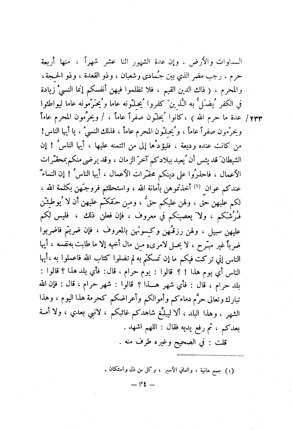 السَّمَوَاتِ وَالأَرْضَ، وَإِنَّ عِدَّةَ الشُّهُورِ اثْنَا عَشَرَ شَهْرًا، مِنْهَا أَرْبَعَةٌ حُرُمٌ، رَجَبُ مُضَرَ الَّذِي بَيْنَ جُمَادَى وَشَعْبَانَ، وَذُو الْقِعْدَةِ، وَذُو الْحِجَّةِ، وَالْمُحَرَّمُ، {ذَلِكَ الدِّينُ الْقَيِّمُ فَلا تَظْلِمُوا فِيهِنَّ أَنْفُسَكُمْ} [التوبة: 36] ، {إِنَّمَا النَّسِيءُ زِيَادَةٌ فِي الْكُفْرِ يُضَلُّ بِهِ الَّذِينَ كَفَرُوا يُحِلُّونَهُ عَامًا وَيُحَرِّمُونَهُ عَامًا لِيُوَاطِئُوا عِدَّةَ مَا حَرَّمَ اللَّهُ} [التوبة: 37] ، كَانُوا يُحِلُّونَ صَفَرًا عَامًا، وَيُحَرِّمُونَ الْمُحَرَّمَ عَامًا، وَيُحَرِّمُونَ صَفَرًا عَامًا، وَيُحِلُّونَ الْمُحَرَّمَ عَامًا، فَذَلِكَ النَّسِيءُ، يَا أَيُّهَا النَّاسُ، مَنْ كَانَتْ عِنْدَهُ وَدِيعَةٌ، فَلْيُؤَدِّهَا إِلَى مَنِ ائْتَمَنَهُ عَلَيْهَا، أَيُّهَا النَّاسُ، إِنَّ الشَّيْطَانَ قَدْ يَئِسَ أَنْ يُعْبَدَ بِبِلادِكُمْ آخِرَ الزَّمَانِ، وَقَدْ يَرْضَى مِنْكُمْ بِمُحَقِّرَاتِ الأَعْمَالِ، فَاحْذَرُوا عَلَى دِينِكُمْ مُحَقِّرَاتِ الأَعْمَالِ، أَيُّهَا النَّاسُ، إِنَّ النِّسَاءَ عِنْدَكُمْ عَوَانٌ أَخَذْتُمُوهُنَّ بِأَمَانَةِ اللَّهِ، وَاسْتَحْلَلْتُمْ فُرُوجَهُنَّ بِكَلِمَةِ اللَّهِ، لَكُمْ عَلَيْهِنَّ حَقٌّ، وَلَهُنَّ عَلَيْكُمْ حَقٌّ، وَمِنْ حَقِّكُمْ عَلَيْهِنَّ أَنْ لا يُوطَئْنَ فَرْشَكُمْ، وَلا يَعْصِيَنَّكُمْ فِي مَعْرُوفٍ، فَإِنْ فَعَلْنَ ذَلِكَ، فَلَيْسَ لَكُمْ عَلَيْهِنَّ سَبِيلٌ، وَلَهُنَّ رِزْقُهُنَّ وَكِسْوَتُهُنَّ بِالْمَعْرُوفِ، فَإِنْ ضَرَبْتُمْ فَاضْرِبُوا ضَرْبًا غَيْرَ مُبَرِّحٍ، لا يَحِلُّ لامْرِئٍ مِنْ مَالِ أَخِيهِ إِلا مَا طَابَتْ بِهِ نَفْسُهُ، أَيُّهَا النَّاسُ، إِنِّي تَرَكْتُ فِيكُمْ مَا إِنْ تَمَسَّكْتُمْ بِهِ لَمْ تَضِلُّوا كِتَابَ اللَّهِ فَاعْمَلُوا بِهِ، أَيُّهَا النَّاسُ، أَيُّ يَوْمٍ هَذَا؟ " قَالُوا: يَوْمٌ حَرَامٌ، قَالَ: «فَأَيُّ بَلَدٍ هَذَا؟» قَالُوا: بَلَدٌ حَرَامٌ، قَالَ: «فَأَيُّ شَهْرٍ هَذَا؟» قَالوا: شَهْرٌ حَرَامٌ، قَالَ: «فَإِنَّ اللَّهَ تَبَارَكَ وَتَعَالَى حَرَّمَ دِمَاءَكُمْ وَأَمْوَالَكُمْ وَأَعْرَاضَكُمْ كَحُرْمَةِ هَذَا الْيَوْمِ، وَهَذَا الشَّهْرِ، وَهَذَا الْبَلَدِ، أَلَا لَيُبَلِّغْ شَاهِدُكُمْ غَائِبَكُمْ، لا نَبِيَّ بَعْدِي، وَلا أُمَّةَ بَعْدِكُمْ» ، ثُمَّ رَفَعَ يَدَيْهِ فَقَالَ: «اللَّهُمَّ اشْهَدْ» .