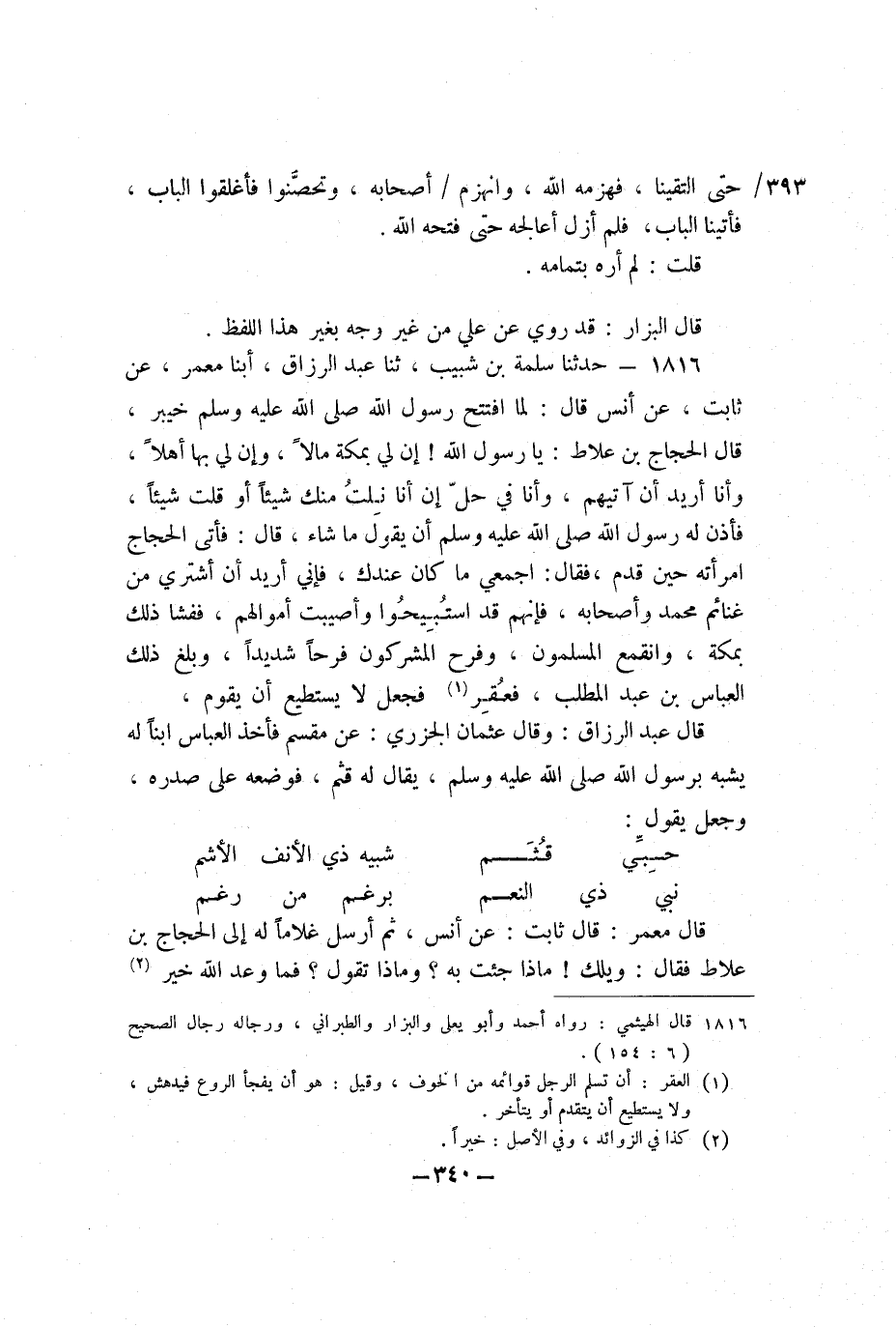 1816 - حَدَّثَنَا سَلَمَةُ بْن شَبِيبٍ، ثنا عَبْدُ الرَّزَّاقِ، أبنا مَعْمَرٌ، عَنْ ثَابِتٍ، عَنْ أَنَسٍ، قَالَ: لَمَّا افْتَتَحَ رَسُولُ اللَّهِ صَلَّى اللَّهُ عَلَيْهِ وَسَلَّمَ خَيْبَرَ، قَالَ الْحَجَّاجُ بْنُ عِلاطٍ: يَا رَسُولَ اللَّهِ، إِنَّ لِي بِمَكَّةَ مَالا، وَإِنَّ لِي بِهَا أَهْلا، وَأَنَا أُرِيدُ أَنْ آتِيَهُمْ، وَأَنَا فِي حِلٍّ إِنْ أَنَا نِلْتُ مِنْكَ شَيْئًا أَوْ قُلْتُ شَيْئًا، فَأَذِنَ لَهُ رَسُولُ اللَّهِ صَلَّى اللَّهُ عَلَيْهِ وَسَلَّمَ أَنْ يَقُولَ مَا شَاءَ، قَالَ: فَأَتَى الْحَجَّاجُ امْرَأَتَهُ حِينَ قَدِمَ، فَقَالَ: اجْمَعِي مَا كَانَ عِنْدِكِ، فَإِنِّي أُرِيدُ أَنْ أَشْتَرِيَ مِنْ غَنَائِمِ مُحَمَّدٍ وَأَصْحَابِهِ، فَإِنَّهُمْ قَدِ اسْتُبِيحُوا وَأُصِيبَتْ أَمْوَالُهُمْ، فَفَشَا ذَلِكَ بِمَكَّةَ، وَانْقَمَعَ الْمُسْلِمُونَ، وَفَرِحَ الْمُشْرِكُونَ فَرَحًا شَدِيدًا، وَبَلَغَ ذَلِكَ الْعَبَّاسَ بْنَ عَبْدِ الْمُطَّلِبِ، فَعُقِرَ فَجَعَلَ لا يَسْتَطِيعُ أَنْ يَقُومَ قَالَ عَبْدُ الرَّزَّاقِ: وَقَالَ عُثْمَانُ الْجَزَرِيُّ: عَنْ مِقْسَمٍ فَأَخَذَ الْعَبَّاسُ ابْنًا لَهُ يُشْبِهُ بِرَسُولِ اللَّهِ صَلَّى اللَّهُ عَلَيْهِ وَسَلَّمَ، يُقَال لَهُ: قُثَمُ، فَوَضَعَهُ عَلَى صَدْرِهِ، وَجَعَلَ يَقُولُ: