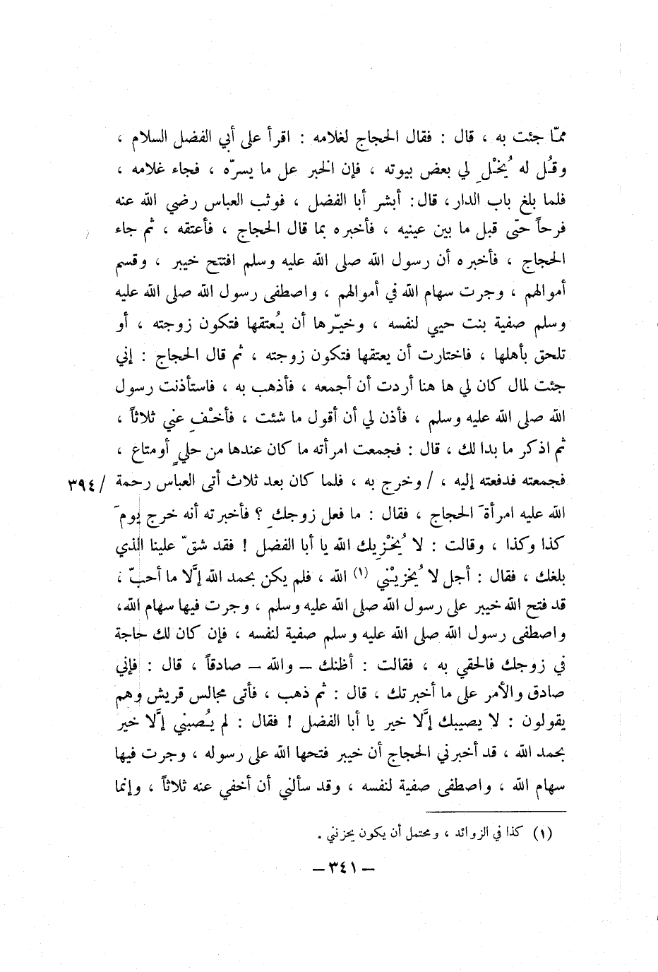 مِمَّا جِئْتَ بِهِ، قَالَ: فَقَالَ الْحَجَّاجُ لِغُلامِهِ: اقْرَأْ عَلَى أَبِي الْفَضْلِ السَّلامَ، وَقُلْ لَهُ يُخْلِ لِي بَعْضَ بُيُوتِهِ، فَإِنَّ الْخَبَرَ عَلَى مَا يَسُرُّهُ، فَجَاءَ غُلامُهُ، فَلَمَّا بَلَغَ بَابَ الدَّارِ، قَالَ: أَبْشِرْ أَبَا الْفَضْلِ، فَوَثَبَ الْعَبَّاسُ رَضِيَ اللَّهُ عَنْهُ فَرَحًا حَتَّى قَبَّلَ مَا بَيْنَ عَيْنَيْهِ، فَأَخْبَرَهُ بِمَا قَالَ الْحَجَّاجُ، فَأَعْتَقَهُ، ثُمَّ جَاءَ الْحَجَّاجُ، فَأَخْبَرَهُ أَنَّ رَسُولَ اللَّهِ صَلَّى اللَّهُ عَلَيْهِ وَسَلَّمَ افْتَتَحَ خَيْبَرَ، وَقَسَّمَ أَمْوَالَهُمْ، وَجَرَتْ سِهَامُ اللَّهِ فِي أَمْوَالِهِمْ، وَاصْطَفَى رَسُولُ اللَّهِ صَلَّى اللَّهُ عَلَيْهِ وَسَلَّمَ صَفِيَّةَ بِنْتَ حُيَيٍّ لِنَفْسِهِ، وَخَيَّرَهَا أَنْ يَعْتِقَهَا فَتَكُونَ زَوْجَتَهُ، أَوْ تَلْحَقَ بِأَهْلِهَا فَاخْتَارَتْ أَنْ يَعْتِقَهَا فَتَكُونَ زَوْجَتَهُ، ثُمَّ قَالَ الْحَجَّاجُ: إِنِّي جِئْتُ لِمَالٍ كَانَ لِي هَهُنَا أَرَدْتُ أَنْ أَجْمَعَهُ، فَأَذْهَبُ بِهِ، فَاسْتَأْذَنْتُ رَسُولَ اللَّهِ صَلَّى اللَّهُ عَلَيْهِ وَسَلَّمَ، فَأَذِنَ لِي أَنْ أَقُولَ مَا شِئْتُ، فَأَخْفِ عَنِّي ثَلاثًا، ثُمَّ اذْكُرْ مَا بَدَا لَكَ، قَالَ: فَجَمَعَتِ امْرَأَتُهُ مَا كَانَ عِنْدِهَا مِنْ حُلَيٍّ أَوْ مَتَاعٍ، فَجَمَعَتْهُ فَدَفَعَتْهُ إِلَيْهِ وَخَرَجَ بِهِ، فَلَمَّا كَانَ بَعْدَ ثَلاثٍ أَتَى الْعَبَّاسُ رَحْمَةُ اللَّهِ عَلَيْهِ امْرَأَةَ الْحَجَّاجِ، فَقَالَ: مَا فَعَلَ زَوْجُكِ؟ فَأَخْبَرَتْهُ أَنَّهُ خَرَجَ يَوْمَ كَذَا وَكَذَا، وَقَالَتْ: لا يُخْزِيكَ اللَّهُ يَا أَبَا الْفَضْلِ، فَقَدْ شَقَّ عَلَيْنَا الَّذِي بَلَغَكَ، فَقَالَ: أَجَلْ لا يُخْزِينِي اللَّهُ، فَلَمْ يَكُنْ بِحَمْدِ اللَّهِ إِلا مَا أَحَبَّ، قَدْ فَتَحَ اللَّهُ خَيْبَرَ عَلَى رَسُولِ اللَّهِ صَلَّى اللَّهُ عَلَيْهِ وَسَلَّمَ، وَجَرَتْ فِيهَا سِهَامُ اللَّهِ وَاصْطَفَى رَسُولُ اللَّهِ صَلَّى اللَّهُ عَلَيْهِ وَسَلَّمَ صَفِيَّةَ لِنَفْسِهِ، فَإِنْ كَانَ لَكِ حَاجَةٌ فِي زَوْجِكِ فَالْحَقِي بِهِ، فَقَالَتْ: أَظُنُّكَ، وَاللَّهِ، صَادِقًا، قَالَ: فَإِنِّي صَادِقٌ وَالأَمْرُ عَلَى مَا أَخْبَرْتُكِ، قَالَ: ثُمَّ ذَهَبَ، فَأَتَى مَجَالِسَ قُرَيْشٍ وَهُمْ يَقُولُونَ: لا يُصِيبُكَ إِلا خَيْرٌ يَا أَبَا الْفَضْلِ، فَقَالَ: لَمْ يُصِبْنِي إِلا خَيْرٌ بِحَمْدِ اللَّهِ، قَدْ أَخْبَرَنِي الْحَجَّاجُ أَنَّ خَيْبَرَ فَتَحَهَا اللَّهُ عَلَى رَسُولِهِ، وَجَرَتْ فِيهَا سِهَامُ اللَّه، وَاصْطَفَى صَفِيَّةَ لِنَفْسِهِ، وَقَدْ سَأَلَنِي أَنْ أُخْفِيَ عَنْهُ ثَلاثًا، وَإِنَّمَا