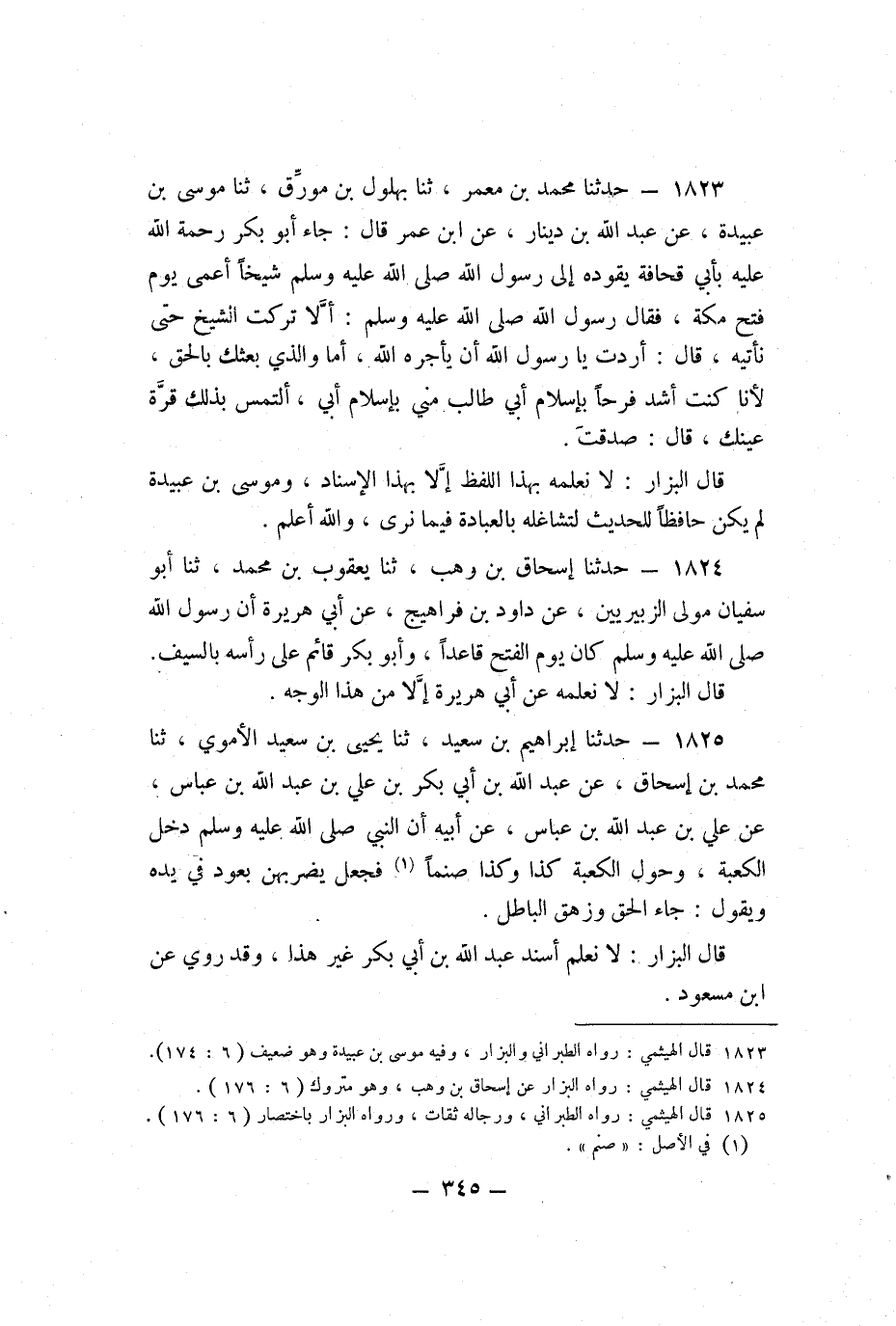 1825 - حَدَّثَنَا إِبْرَاهِيمُ بْنُ سَعِيدٍ، ثنا يَحْيَى بْنُ سَعِيدٍ الأُمَوِيُّ، ثنا مُحَمَّدُ بْنُ إِسْحَاقَ، عَنْ عَبْدِ اللَّهِ بْنِ أَبِي بَكْرِ بْنِ عَلِيِّ بْنِ عَبْدِ اللَّهِ بْنِ عَبَّاسٍ، عَنْ عَلِيِّ بْنِ عَبْدِ اللَّهِ بْنِ عَبَّاسٍ، عَنْ أَبِيهِ أَنَّ النَّبِيَّ صَلَّى اللَّهُ عَلَيْهِ وَسَلَّمَ دَخَلَ الْكَعْبَةَ، وَحَوْلَ الْكَعْبَةِ كَذَا وَكَذَا صَنَمًا، فَجَعَلَ يَضْرِبُهُنَّ بِعُودٍ فِي يَدِهِ وَيَقُولُ: «جَاءَ الْحَقُّ وَزَهَقَ الْبَاطِلُ» .