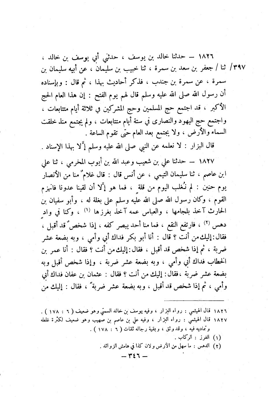 1826 - حَدَّثَنَا خَالِدُ بْنُ يُوسُفَ، حَدَّثَنِي أَبِي يُوسُفُ بْنُ خَالِدٍ، ثنا جَعْفَرُ بْنُ سَعْدِ بْنِ سَمُرَةَ، ثنا خُبَيْبُ بْنُ سُلَيْمَانَ، عَنْ أَبِيهِ سُلَيْمَانَ بْنِ سَمُرَةَ، عَنْ سَمُرَةَ بْنِ جُنْدُبٍ، فَذَكَرَ أَحَادِيثَ بِهَذَا، ثُمَّ قَالَ: وَبِإِسْنَادِهِ أَنَّ رَسُولَ اللَّهِ صَلَّى اللَّهُ عَلَيْهِ وَسَلَّمَ قَالَ لَهُمْ يَوْمَ الْفَتْحِ: «إِنَّ هَذَا الْعَامَ الْحَجُّ الأَكْبَرُ، قَدِ اجْتَمَعَ حَجُّ الْمُسْلِمِينَ وَحَجُّ الْمُشْرِكِينَ فِي ثَلاثَةِ أَيَّامٍ مُتَتَابِعَاتٍ، وَاجْتَمَعَ حَجُّ الْيَهُودِ وَالنَّصَارَى فِي سِتَّةِ أَيَّامٍ مُتَتَابِعَاتٍ، وَلَمْ يَجْتَمِعْ مُنْذُ خُلِقَتِ السَّمَاءُ وَالأَرْضُ، وَلا يَجْتَمِعُ بَعْدَ الْعَامِ حَتَّى تَقُومَ السَّاعَةُ» .