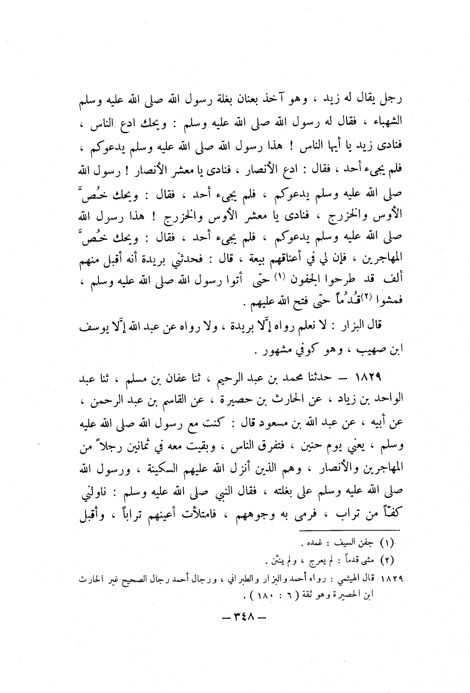 1829 - حَدَّثَنَا مُحَمَّدُ بْنُ عَبْدِ الرَّحِيمِ، ثنا عَفَّانُ بْنُ مُسْلِمٍ، ثنا عَبْدُ الْوَاحِدِ بْنُ زِيَادٍ، عَنِ الْحَارِثِ بْنِ حَصِيرَةَ، عَنِ الْقَاسِمِ بْنِ عَبْدِ الرَّحْمَنِ، عَنْ أَبِيهِ، عَنْ عَبْدِ اللَّهِ بْنِ مَسْعُودٍ قَالَ: كُنْتُ مَعَ رَسُولِ اللَّهِ صَلَّى اللَّهُ عَلَيْهِ وَسَلَّمَ، يَعْنِي يَوْمَ حُنَيْنٍ فَتَفَرَّقَ النَّاسُ وَبَقِيتُ مَعَهُ فِي ثَمَانِينَ رَجُلا مِنَ الْمُهَاجِرِينَ وَالأَنْصَارِ، وَهُمُ الَّذِينَ أَنْزَلَ اللَّهُ عَلَيْهِمُ السَّكِينَةَ، وَرَسُولُ اللَّهِ صَلَّى اللَّهُ عَلَيْهِ وَسَلَّمَ عَلَى بَغْلَتِهِ، فَقَالَ النَّبِيُّ صَلَّى اللَّهُ عَلَيْهِ وَسَلَّمَ: نَاوِلْنِي كَفًّا مِنْ تُرَابٍ فَرَمَى بِهِ وُجُوهَهُمْ، فَامْتَلأَتْ أَعْيُنُهُمْ تُرَابًا، وَأَقْبَلَ