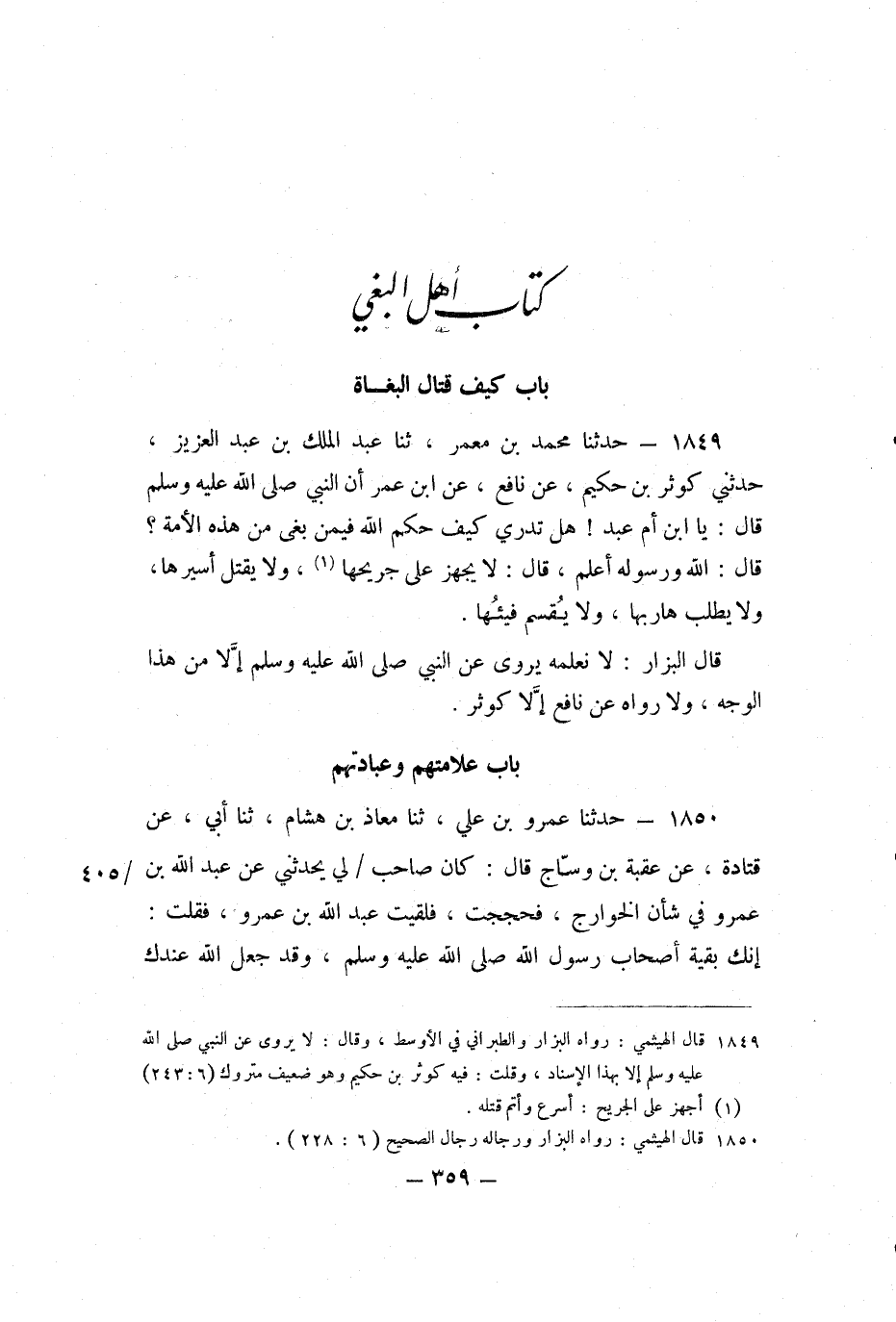 1849 - حَدَّثَنَا مُحَمَّدُ بْنُ مَعْمَرٍ، ثنا عَبْدُ الْمَلِكِ بْنُ عَبْدِ الْعَزِيزِ، حَدَّثَنِي كَوْثَرُ بْنُ حَكِيمٍ، عَنْ نَافِعٍ، عَنِ ابْنِ عُمَرَ أَنَّ النَّبِيَّ صَلَّى اللَّهُ عَلَيْهِ وَسَلَّمَ قَالَ: «يَا ابْنَ أُمِّ عَبْدٍ، هَلْ تَدْرِي كَيْفَ حُكْمُ اللَّهِ فِيمَنْ بَغَى مِنْ هَذِهِ الأُمَّةِ؟» قَالَ: اللَّهُ وَرَسُولُهُ أَعْلَمُ، قَالَ: «لا يُجْهَزُ عَلَى جَرِيحِهَا، وَلا يُقْتَلُ أَسِيرُهَا، وَلا يُطْلَبُ هَارِبُهَا، وَلا يُقْسَمُ فَيْئُهَا» .