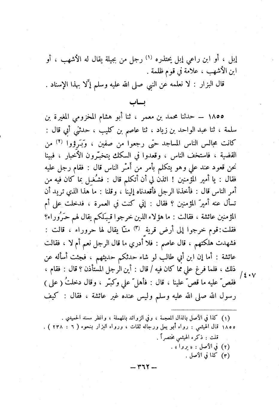 1855 - حَدَّثَنَا مُحَمَّدُ بْنُ مَعْمَرٍ، ثنا أَبُو هِشَامٍ الْمَخْزُومِيُّ الْمُغِيرَةُ بْنُ سَلَمَةَ، ثنا عَبْدُ الْوَاحِدِ بْنُ زِيَادٍ، ثنا عَاصِمُ بْنُ كُلَيْبٍ، حَدَّثَنِي أَبِي قَالَ: كَانَتْ مَجَالِسُ النَّاسِ الْمَسَاجِدَ حَتَّى رَجَعُوا مِنْ صِفِّينَ، وَبَرِئُوا مِنَ الْقَضِيَّةِ، فَاسْتَخَفَّ النَّاسُ، وَقَعَدُوا فِي السِّكَكِ يَتَخَبَّرُونَ الأَخْبَارَ، فَبَيْنَا نَحْنُ قُعُودٌ عِنْدَ عَلِيٍّ، وَهُوَ يَتَكَلَّمُ بِأَمْرٍ مِنْ أَمْرِ النَّاسِ، قَالَ: فَقَامَ رَجُلٌ عَلَيْهِ فَقَالَ: يَا أَمِيرَ الْمُؤْمِنِينَ، ائْذَنْ لِي أَنْ أَتَكَلَّمَ، قَالَ: فَشُغِلَ بِمَا كَانَ فِيهِ مِنْ أَمْرِ النَّاسِ، قَالَ: فَأَخَذْنَا الرَّجُلَ فَأَقْعَدْنَاهُ إِلَيْنَا، وَقُلْنَا: مَا هَذَا الَّذِي تُرِيدُ أَنْ تَسْأَلَ عَنْهُ أمِيرَ الْمُؤْمِنِينَ؟ فَقَالَ: إِنِّي كُنْتُ فِي الْعُمْرَةِ، فَدَخَلْتُ عَلَى أُمِّ الْمُؤْمِنِينَ عَائِشَةَ، فَقَالَتْ: مَا هَؤُلاءِ الَّذِينَ خَرَجُوا قَبْلَكُمْ، يُقَالُ لَهُمْ: حَرُورَاءُ؟ فَقُلْتُ: قَوْمٌ خَرَجُوا إِلَى أَرْضِ قَرْيَةٍ مِنَّا يُقَال لَهَا: حَرُورَاءُ، قَالَتْ: فَشَهِدْتُ هَلَكَتَهُمْ، قَالَ عَاصِمٌ: فَلا أَدْرِي مَا قَالَ الرَّجُلُ؛ نَعَمْ أَمْ لا، فَقَالَتْ عَائِشَةُ: أَمَا إِنَّ ابْنَ أَبِي طَالِبٍ لَوْ شَاءَ حَدَّثَكُمْ حَدِيثَهُمْ، فَجِئْتُ أَسْأَلُهُ عَنْ ذَلِكَ، فَلَمَّا فَرَغَ عَلِيٌّ مِمَّا كَانَ فِيهِ قَالَ: أَيْنَ الرَّجُلُ الْمُسْتَأْذِنُ؟ قَالَ: فَقَامَ، فَقَصَّ عَلَيْهِ مَا قَصَّ عَلَيْنَا، قَالَ: فأَهَلَّ عَلِيٌّ وَكَبَّرَ، وَقَالَ: دَخَلْتُ عَلَى رَسُولِ اللَّهِ صَلَّى اللَّهُ عَلَيْهِ وَسَلَّمَ وَلَيْسَ عِنْدَهُ غَيْر عَائِشَةَ، فَقَالَ: «كَيْفَ