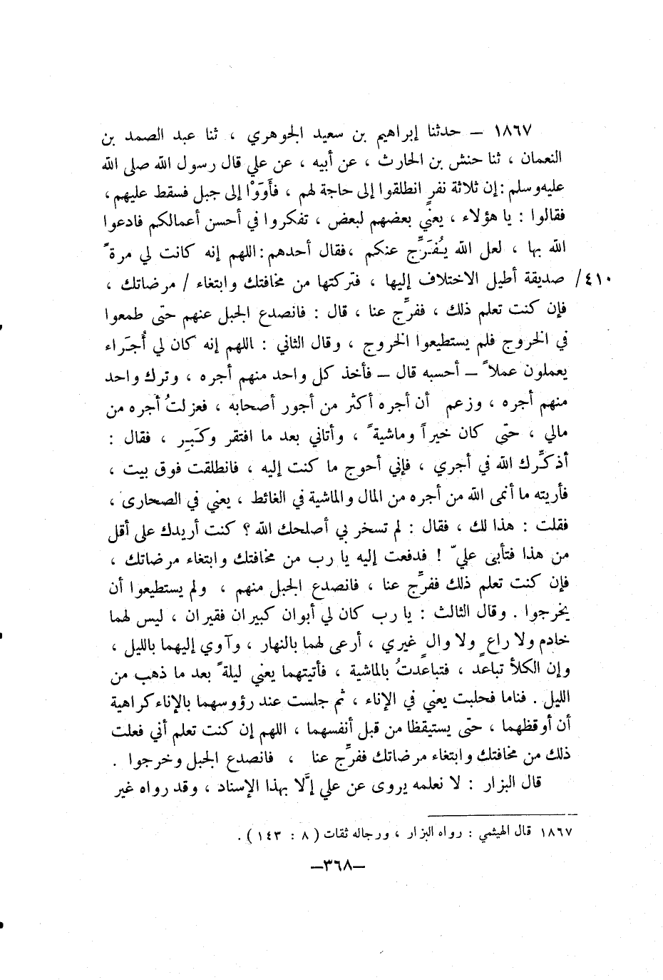1867 - حَدَّثَنَا إِبْرَاهِيمُ بْنُ سَعِيدٍ الْجَوْهَرِيُّ، ثنا عَبْدُ الصَّمَدِ بْنُ النُّعْمَانِ، ثنا حَنَشُ بْنُ الْحَارِثِ، عَنْ أَبِيهِ، عَنْ عَلِيٍّ قَالَ رَسُولُ اللَّهِ صَلَّى اللَّهُ عَلَيْهِ وَسَلَّمَ: " إِنَّ ثَلاثَةَ نَفَرٍ انْطَلَقُوا إِلَى حَاجَةٍ لَهُمْ، فَأَوَوْا إِلَى جَبَلٍ فَسَقَطَ عَلَيْهِمْ، فَقَالُوا: يَا هَؤُلاءِ، يَعْنِي: بَعْضُهُمْ لِبَعْضٍ، تَفَكَّرُوا فِي أَحْسَنِ أَعْمَالِكُمْ فَادْعُوا اللَّهَ بِهَا، لَعَلَّ اللَّهَ يُفَرِّجُ عَنْكُمْ، فَقَالَ أَحَدُهُمْ: اللَّهُمَّ إِنَّهُ كَانَتْ لِي مَرَّةً صَدِيقَةٌ أُطِيلُ الاخْتِلافَ إِلَيْهَا، فَتَرَكْتُهَا مِنْ مَخَافَتِكَ وَابْتِغَاءَ مَرْضَاتِكَ، فَإِنْ كُنْتَ تَعْلَمُ ذَلِكَ، فَفَرِّجْ عَنَّا، قَالَ: فَانْصَدَعَ الْجَبَلُ عَنْهُمْ حَتَّى طَمِعُوا فِي الْخُرُوجِ فَلَمْ يَسْتَطِيعُوا الْخُرُوجَ، وَقَالَ الثَّانِي: اللَّهُمَّ إِنَّهُ كَانَ لِي أُجَرَاءُ يَعْمَلُونَ عَمَلا، أَحْسِبُهُ قَالَ: فَأَخَذَ كُلُّ وَاحِدٍ مِنْهُمْ أَجْرَهُ، وَتَرَكَ وَاحِدٌ مِنْهُمْ أَجْرَهُ، وَزَعِمَ أَنَّ أَجْرَهُ أَكْثَرُ مِنْ أُجُورِ أَصْحَابِهِ، فَعَزَلْتُ أَجْرَهُ مِنْ مَالِي، حَتَّى كَانَ خَيْرًا وَمَاشِيَةً، وَأَتَانِي بَعْدَ مَا افْتَقَرَ وَكَبِرَ، فَقَالَ: أُذَكِّرُكَ اللَّهَ فِي أَجْرِي، فَإِنِّي أَحْوَجُ مَا كُنْتُ إِلَيْهِ، فَانْطَلَقْتُ فَوْقَ بَيْتٍ، فَأَرَيْتُهُ مَا أَنْمَى اللَّهُ مِنْ أَجِرِه مِنَ الْمَالِ وَالْمَاشِيَةِ فِي الْغَائِطِ، يَعْنِي: فِي الصَّحَارَى، فَقُلْتُ: هَذَا لَكَ، فَقَالَ: لِمَ تَسْخَرُ بِي أَصْلَحَكَ اللَّهُ؟ كُنْتُ أُرِيدُكَ عَلَى أَقَلِّ مِنْ هَذَا فَتَأْبَى عَلَيَّ! فَدَفَعْتُ إِلَيْهِ يَا رَبِّ مِنْ مَخَافَتِكَ وَابْتِغَاءِ مَرْضَاتِكَ، فَإِنْ كُنْتَ تَعْلَمُ ذَلِكَ فَفَرِّجْ عَنَّا، فَانْصَدَعَ الْجَبَلُ مِنْهُمْ، وَلَمْ يَسْتَطِيعُوا أَنْ يَخْرُجُوا.
