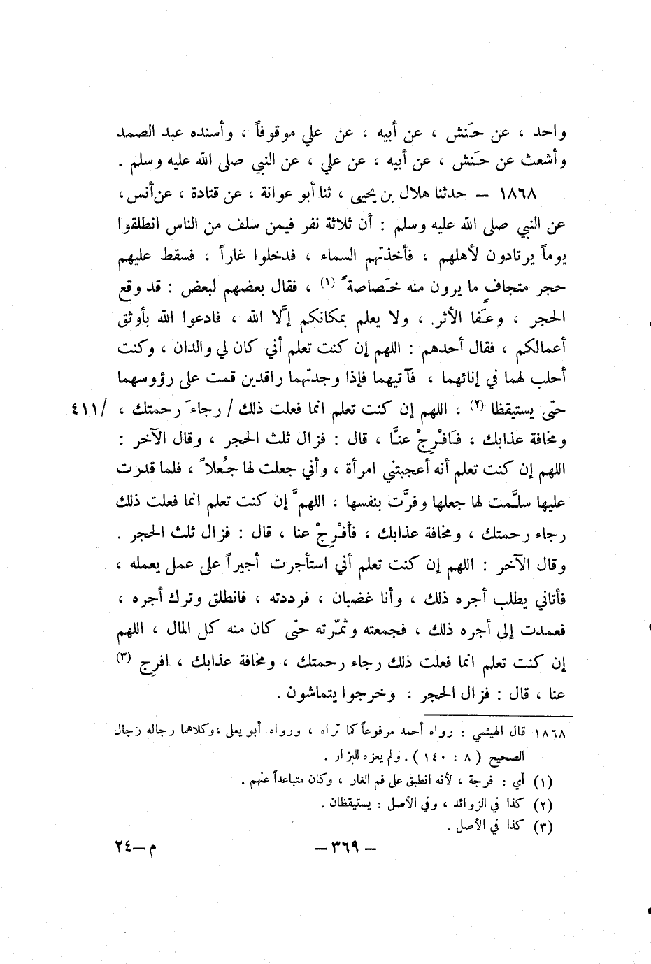 1868 - حَدَّثَنَا هِلَالُ بْنُ يَحْيَى، ثنا أَبُو عَوَانَةَ، عَنْ قَتَادَةَ، عَنْ أنَسٍ، عَنِ النَّبِيِّ صَلَّى اللَّهُ عَلَيْهِ وَسَلَّمَ: " أَنَّ ثَلاثَةَ نَفَرٍ فِيمَنْ سَلَفَ مِنَ النَّاسِ انْطَلَقُوا يَوْمًا يَرْتَادُونَ لأَهْلِهِمْ، فَأَخَذَتْهُمُ السَّمَاءُ، فَدَخَلُوا غَارًا، فَسَقَطَ عَلَيْهِمْ حَجَرٌ مُتَجَافٍ مَا يَرَوْنَ مِنْهُ خَصَاصَةً، فَقَالَ بَعْضُهُمْ لِبَعْضٍ: قَدْ وَقَعَ الْحَجَرُ، وَعَفَا الأَثَرُ، وَلا يَعْلَمُ بِمَكَانِكُمْ إِلا اللَّهَ، فَادْعُوا اللَّهَ بِأَوْثَقِ أَعْمَالِكُمْ، فَقَالَ أَحَدُهُمْ: اللَّهُمَّ إِنْ كُنْتَ تَعْلَمُ أَنِّي كَانَ لِي وَالِدَانِ، وَكُنْتُ أَحْلِبُ لَهُمَا فِي إِنَائِهِمَا، فَآتِيهِمَا فَإِذَا وَجَدْتُهُمَا رَاقِدَيْنِ قُمْتُ عَلَى رُءُوسِهِمَا حَتَّى يَسْتَيْقِظَا، اللَّهُمَّ إِنْ كُنْتَ تَعْلَمُ إِنَّمَا فَعَلْتُ ذَلِكَ رَجَاءَ رَحْمَتِكَ، وَمَخَافَةَ عَذَابِكَ، فَافْرُجْ عَنَّا، قَالَ: فَزَالَ ثُلُثُ الْحَجَرِ، وَقَالَ الآخَرُ: اللَّهُمَّ إِنْ كُنْتَ تَعْلَمُ أَنَّهُ أَعْجَبَتْنِي امْرَأَةٌ، وَأَنِّي جَعَلْتُ لَهَا جُعْلا، فَلَمَّا قَدَرْتُ عَلَيْهَا سَلَّمْتُ لَهَا جُعْلَهَا وَفَرَّتْ بِنَفْسِهَا، اللَّهُمَّ إِنْ كُنْتَ تَعْلَمُ إِنَّمَا فَعَلْتُ ذَلِكَ رَجَاءَ رَحْمَتِكَ، وَمَخَافَةَ عَذَابِكَ، فَأَفْرِجْ عَنَّا، قَالَ: فَزَالَ ثُلُثَ الْحَجَرِ.