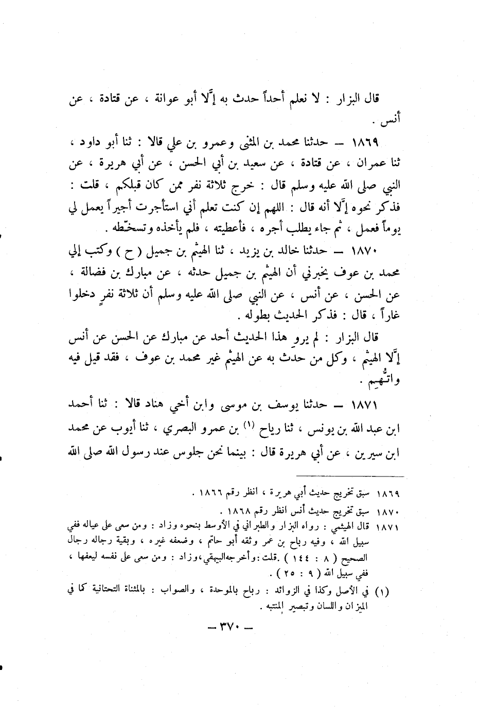 قَالَ الْبَزَّارُ: لَمْ يَرْوِ هَذَا الْحَدِيثَ أَحَدٌ عَنْ مُبَارَكٍ، عَنِ الْحَسَنِ، عَنْ أنَسٍ إِلا الْهَيْثَمِ، وَكُلُّ مَنْ حَدَّثَ بِهِ عَنِ الْهَيْثَمِ غَيْرَ مُحَمَّدِ بْنِ عَوْفٍ، فَقَدْ قِيلَ فِيهِ وَاتُّهِمَ.