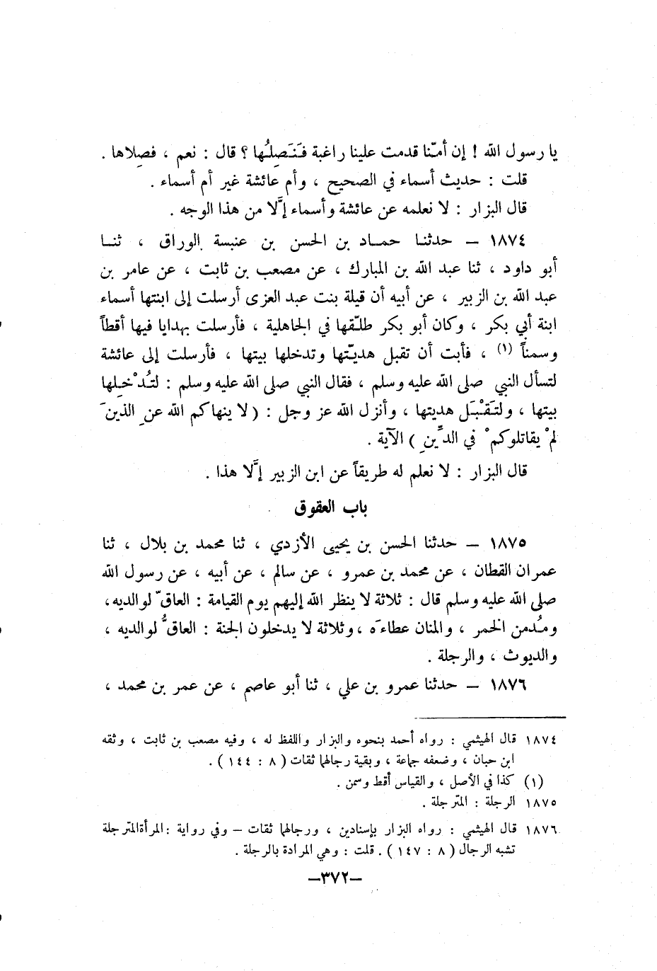 قَالَ الْبَزَّارُ: لا نَعْلَمُهُ عَنْ عَائِشَةَ وَأَسْمَاءَ إِلا مِنْ هَذَا الْوَجْهِ.