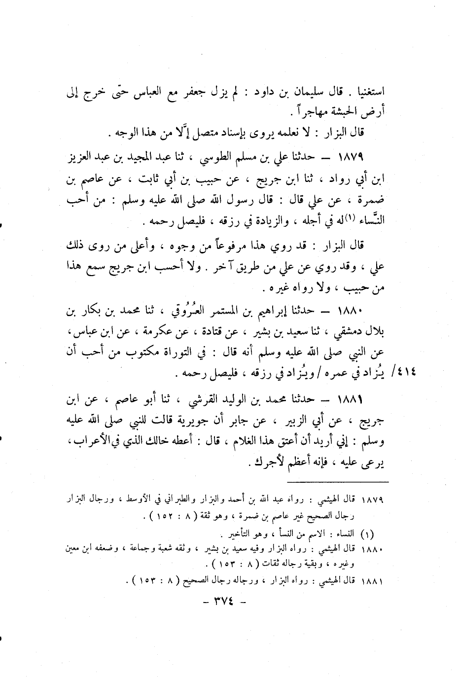 1879 - حَدَّثَنَا عَلِيُّ بْنُ مُسْلِمٍ الطُّوسِيُّ، ثنا عَبْدُ الْمَجِيدِ بْنُ عَبْدِ الْعَزِيزِ ابْنِ أَبِي رَوَّادٍ، ثنا ابْنُ جُرَيْجٍ، عَنْ حَبِيبِ بْنِ أَبِي ثَابِتٍ، عَنْ عَاصِمِ بْنِ ضَمْرَةَ، عَنْ عَلِيٍّ، قَالَ: قَالَ رَسُولُ اللَّهِ صَلَّى اللَّهُ عَلَيْهِ وَسَلَّمَ: «مَنْ أَحَبَّ النَّسَاءَ لَهُ فِي أَجَلِهِ، وَالزِّيَادَة فِي رِزْقِهِ، فَلْيَصِلْ رَحِمَهُ» .