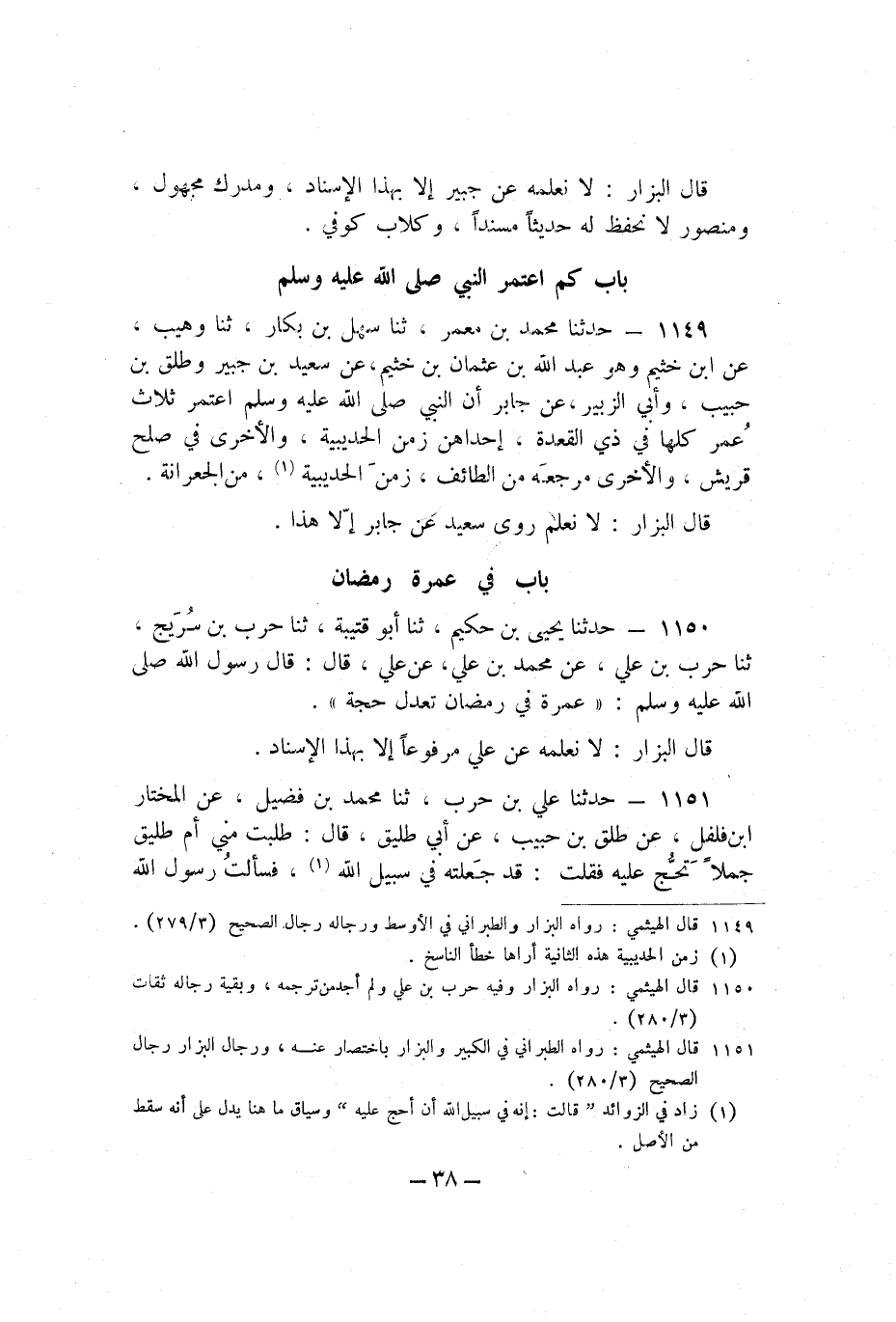 1149 - حَدَّثَنَا مُحَمَّدُ بْنُ مَعْمَرٍ، ثنا سَهْلُ بْنُ بَكَّارٍ، ثنا وُهَيْبٌ، عَنِ ابْنِ خُثَيْمٍ، وَهُوَ عَبْدُ اللَّهِ بْنُ عُثْمَانَ بْنِ خُثَيْمٍ، عَنْ سَعِيدِ بْنِ جُبَيْرٍ، وَطَلْقِ بْنِ حَبِيبٍ، وَأَبِي الزُّبَيْرِ، عَنْ جَابِرٍ، أَنَّ النَّبِيَّ صَلَّى اللَّهُ عَلَيْهِ وَسَلَّمَ اعْتَمَرَ ثَلاثَ عُمَرٍ، كُلُّهَا فِي ذِي الْقِعْدَةِ، إِحْدَاهُنَّ فِي زَمَنِ الْحُدَيْبِيَةِ، وَالأُخْرَى فِي صُلْحِ قُرَيْشٍ، وَالأُخْرَى مَرْجِعَهُ مِنَ الطَّائِفِ، زَمَنَ حُنَيْنٍ، مِنَ الْجِعِرَّانَةِ.