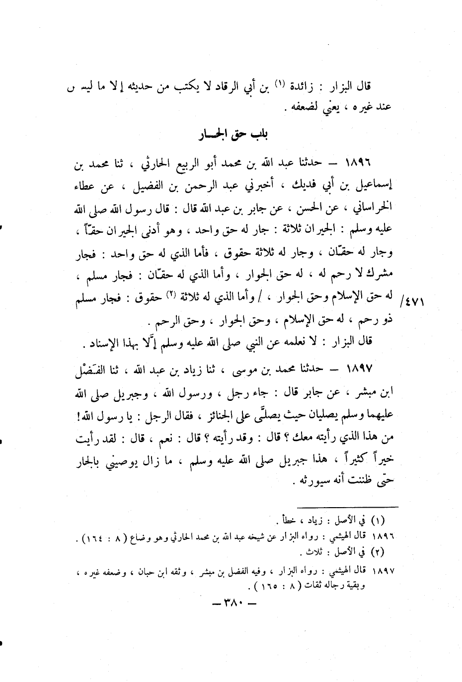 1896 - حَدَّثَنَا عَبْدُ اللَّهِ بْنُ مُحَمَّدٍ أَبُو الرَّبِيعِ الْحَارِثِيُّ، ثنا مُحَمَّدُ بْنُ إِسْمَاعِيلَ ابْنِ أَبِي فُدَيْكٍ، أَخْبَرَنِي عَبْدُ الرَّحْمَنِ بْنُ الْفُضَيْلِ، عَنْ عَطَاءٍ الْخُرَاسَانِيِّ، عَنِ الْحَسَنِ، عَنْ جَابِرِ بْنِ عَبْدِ اللَّهِ، قَالَ: قَالَ رَسُولُ اللَّهِ صَلَّى اللَّهُ عَلَيْهِ وَسَلَّمَ: " الْجِيرَانُ ثَلاثَةٌ: جَارٌ لَهُ حَقٌّ وَاحِدٌ، وَهُوَ أَدْنَى الْجِيرَانِ حَقًّا، وَجَارٌ لَهُ حَقَّانِ، وَجَارٌ لَهُ ثَلاثَةُ حُقُوقٍ، فَأَمَّا الَّذِي لَهُ حَقٌّ وَاحِدٌ: فَجَارٌ مُشْرِكٌ لا رَحِمَ لَهُ، لَهُ حَقُّ الْجِوَارِ، وَأَمَّا الَّذِي لَهُ حَقَّانِ: فَجَارٌ مُسْلِمٌ، لَهُ حَقُّ الإِسْلامِ وَحَقُّ الْجِوَارِ، وَأَمَّا الَّذِي لَهُ ثَلاثَةُ حُقُوقٍ: فَجَارٌ مُسْلِمٌ ذُو رَحِمٍ، لَهُ حَقُّ الإِسْلامِ، وَحَقُّ الْجِوَارِ، وَحَقُّ الرَّحِمِ ".
