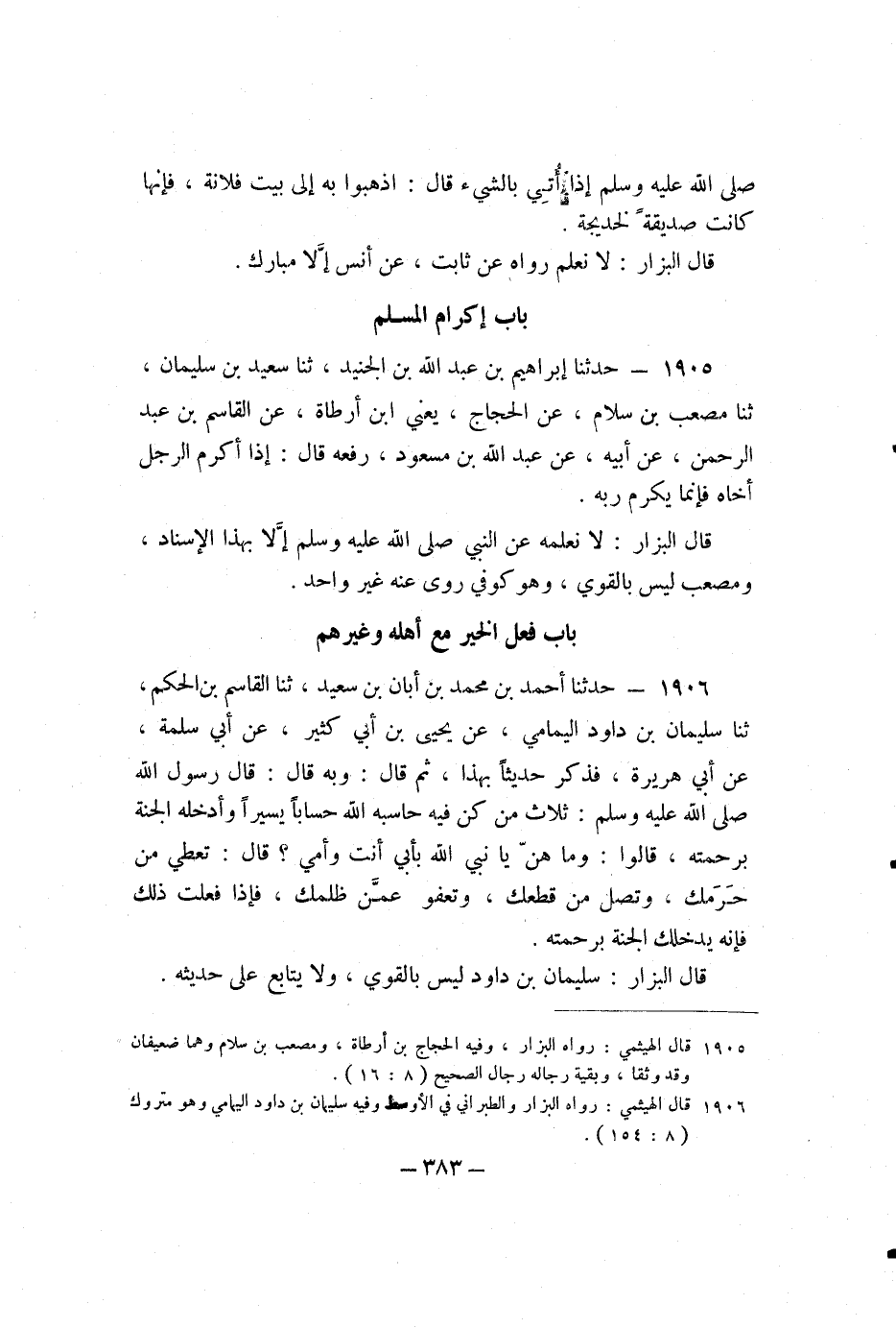 1905 - حَدَّثَنَا إِبْرَاهِيمُ بْنُ عَبْدِ اللَّهِ بْنِ الْجُنَيْدِ، ثنا سَعِيدُ بْنُ سُلَيْمَانَ، ثنا مُصْعَبُ بْنُ سَلامٍ، عَنِ الْحَجَّاجِ، يَعْنِي: ابْنَ أَرْطَاةَ، عَنِ الْقَاسِمِ بْنِ عَبْدِ الرَّحْمَنِ، عَنْ أَبِيهِ، عَنْ عَبْدِ اللَّهِ بْنِ مَسْعُودٍ، رَفَعَهُ، قَالَ: إِذَا أَكْرَمَ الرَّجُلُ أَخَاهُ فَإِنَّمَا يُكْرِمُ رَبَّهُ.