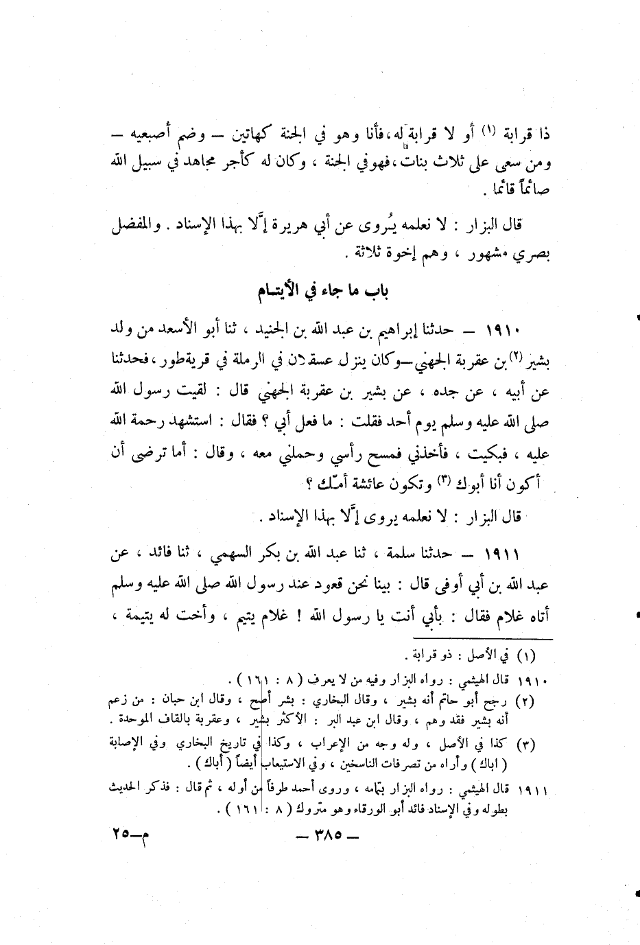 1910 - حَدَّثَنَا إِبْرَاهِيمُ بْنُ عَبْدِ اللَّهِ بْنِ الْجُنَيْدِ، ثنا أَبُو الأَسْعَدِ مِنْ وَلَدِ بَشِيرِ بْنِ عَقْرَبَةَ الْجُهَنِيِّ، وَكَانَ يَنْزِلُ عَسْقَلانَ فِي الرَّمْلَةِ فِي قَرْيَةِ طُورٍ، فَحَدَّثَنَا عَنْ أَبِيهِ، عَنْ جَدِّهِ، عَنْ بَشِيرِ بْنِ عَقْرَبَةَ الْجُهَنِيِّ، قَالَ: لَقِيتُ رَسُولَ اللَّهِ صَلَّى اللَّهُ عَلَيْهِ وَسَلَّمَ يَوْمَ أُحُدٍ فَقُلْتُ: مَا فَعَلَ أَبِي؟ فَقَالَ: «اسْتُشْهِدَ رَحْمَةُ اللَّهِ عَلَيْهِ» ، فَبَكَيْتُ، فَأَخَذَنِي فَمَسَحَ رَأْسِي وَحَمَلَنِي مَعَهُ، وَقَالَ: «أَمَا تَرْضَى أَنْ أَكُونَ أَنَا أَبُوكَ، وَتَكُونَ عَائِشَةُ أُمَّكَ» ؟ قَالَ الْبَزَّارُ: لا نَعْلَمُهُ يُرْوَى إِلا بِهَذَا الإِسْنَادِ.