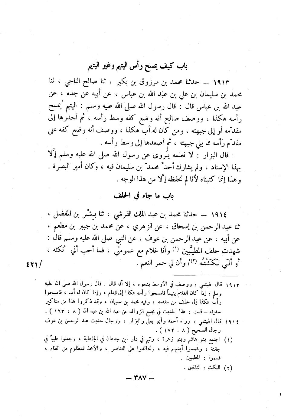 1913 - حَدَّثَنَا مُحَمَّدُ بْنُ مَرْزُوقِ بْنِ بُكَيْرٍ، ثنا صَالِحٌ النَّاجِيُّ، ثنا مُحَمَّدُ بْنُ سُلَيْمَانَ بْنِ عَلِيِّ بْنِ عَبْدِ اللَّهِ بْنِ عَبَّاسٍ، عَنْ أَبِيهِ، عَنْ جَدِّهِ، عَنْ عَبْدِ اللَّهِ بْنِ عَبَّاسٍ، قَالَ: قَالَ رَسُولُ اللَّهِ صَلَّى اللَّهُ عَلَيْهِ وَسَلَّمَ: «الْيَتِيمُ يُمْسَحُ رَأْسُهُ هَكَذَا، وَوَصَفَ صَالِحٌ أَنَّهُ وَضَعَ كَفَّهُ وَسَطَ رَأْسِهِ، ثُمَّ أَحْدَرَهَا إِلَى مُقَدَّمِهِ أَوْ إِلَى جَبْهَتِهِ، وَمَنْ كَانَ لَهُ أَبٌ هَكَذَا، وَوَصَفَ أَنَّهُ وَضَعَ كَفَّهُ عَلَى مُقَدَّمِ رَأْسِهِ مِمَّا يَلِي جَبْهَتَهُ، ثُمَّ أَصْعَدَهَا إِلَى وَسَطِ رَأْسِهِ» .