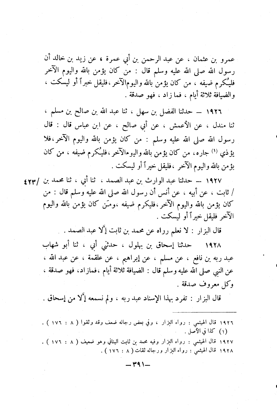 1928 - حَدَّثَنَا إِسْحَاقُ بْنُ بُهْلُولٍ، حَدَّثَنِي أَبِي، ثنا أَبُو شِهَابٍ عَبْدُ رَبِّهِ بْنُ نَافِعٍ، عَنْ مُسْلِمٍ، عَنْ إِبْرَاهِيمَ، عَنْ عَلْقَمَةَ، عَنْ عَبْدِ اللَّهِ، عَنِ النَّبِيِّ صَلَّى اللَّهُ عَلَيْهِ وَسَلَّمَ، قَالَ: «الضِّيَافَةُ ثَلاثَةُ أَيَّامٍ، فَمَا زَادَ، فَهُوَ صَدَقَةٌ، وَكُلُّ مَعْرُوفٍ صَدَقَةٌ» .