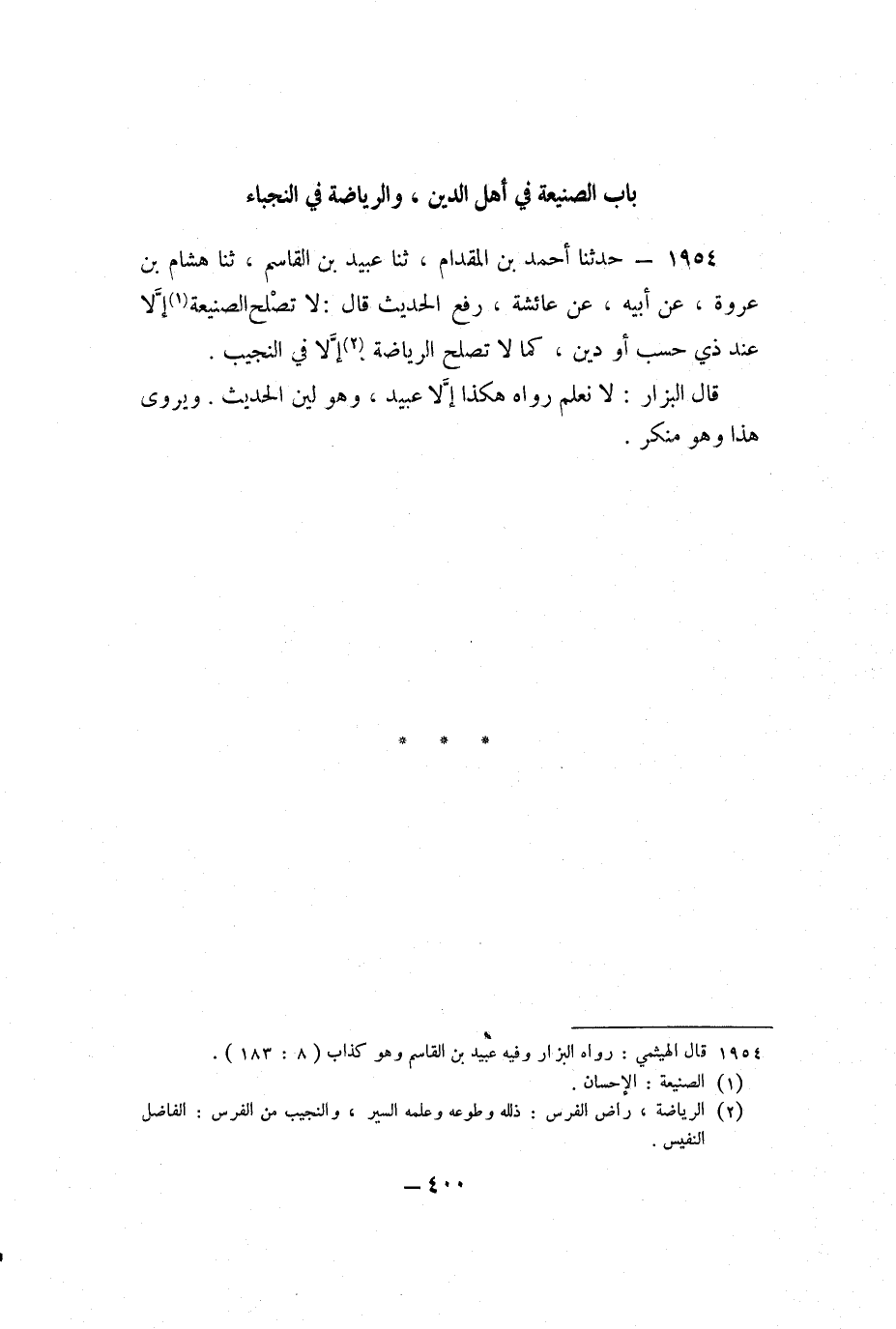 1954 - حَدَّثَنَا أَحْمَدُ بْنُ الْمِقْدَامِ، ثنا عُبَيْدُ بْنُ الْقَاسِمِ، ثنا هِشَامُ بْنُ عُرْوَةَ، عَنْ أَبِيهِ، عَنْ عَائِشَةَ، رَفَعَ الْحَدِيثَ قَالَ: لا تَصْلُحُ الصَّنِيعَةَ إِلا عِنْدَ ذِي حَسَبٍ أَوْ دِينٍ، كَمَا لا تَصْلُحُ الرِّيَاضَةُ إِلا فِي النَّجِيبِ.