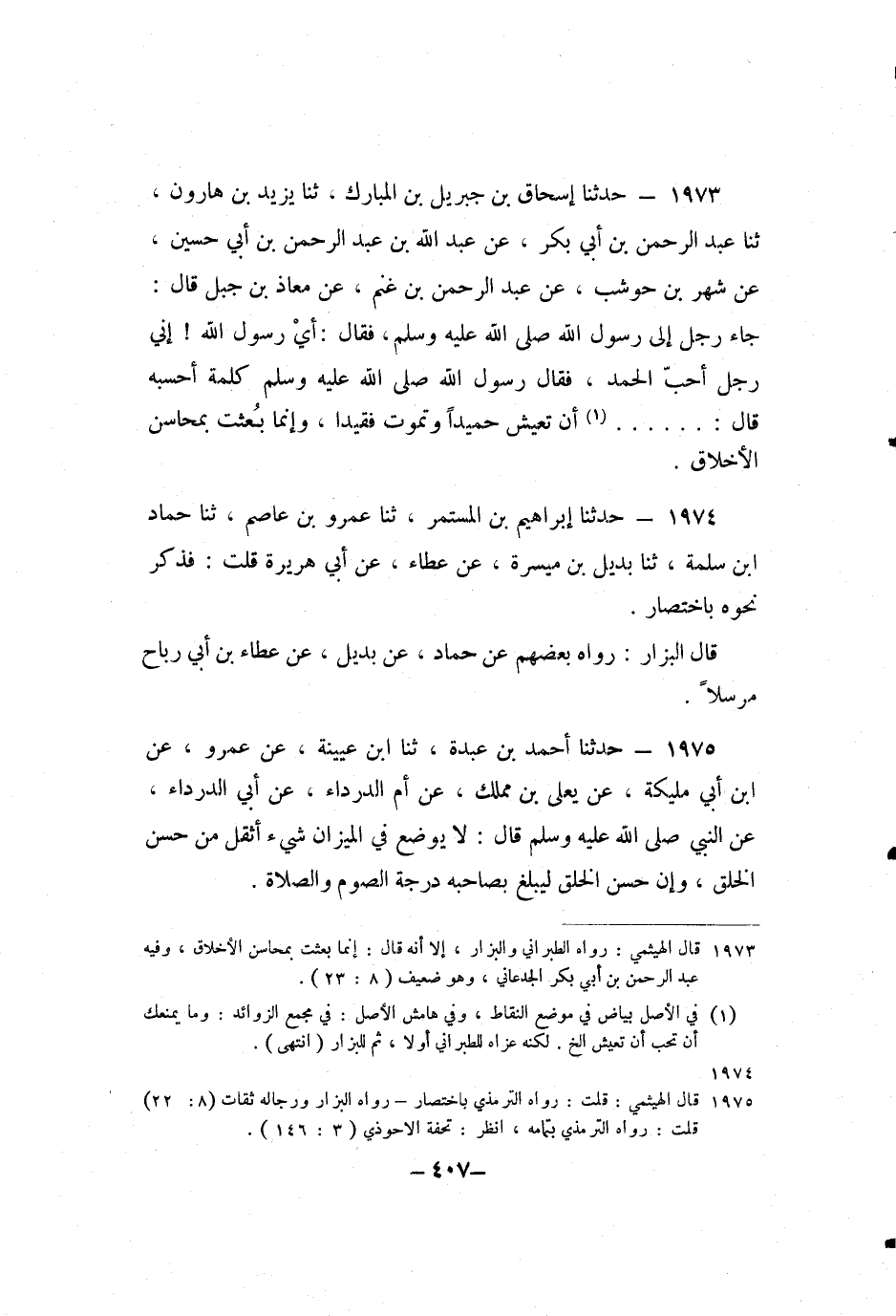 1973 - حَدَّثَنَا إِسْحَاقُ بْنُ جِبْرِيلَ بْنِ الْمُبَارَكِ، ثنا يَزِيدُ بْنُ هَارُونَ، ثنا عَبْدُ الرَّحْمَنِ بْنُ أَبِي بَكْرٍ، عَنْ عَبْدِ اللَّهِ بْنِ عَبْد الرَّحْمَنِ بْن أَبِي حُسَيْنٍ، عَنْ شَهْرِ بْنِ حَوْشَبٍ، عَنْ عَبْدِ الرَّحْمَنِ بْنِ غَنْمٍ، عَنْ مُعَاذِ بْنِ جَبَلٍ، قَالَ: جَاءَ رَجُلٌ إِلَى رَسُولِ اللَّهِ صَلَّى اللَّهُ عَلَيْهِ وَسَلَّمَ فَقَالَ: أَيْ رَسُولَ اللَّهِ، إِنِّي رَجُلٌ أُحِبُّ الْحَمْدَ، فَقَالَ رَسُولُ اللَّهِ صَلَّى اللَّهُ عَلَيْهِ وَسَلَّمَ كَلِمَةً، أَحْسِبُهُ قَالَ: «.......