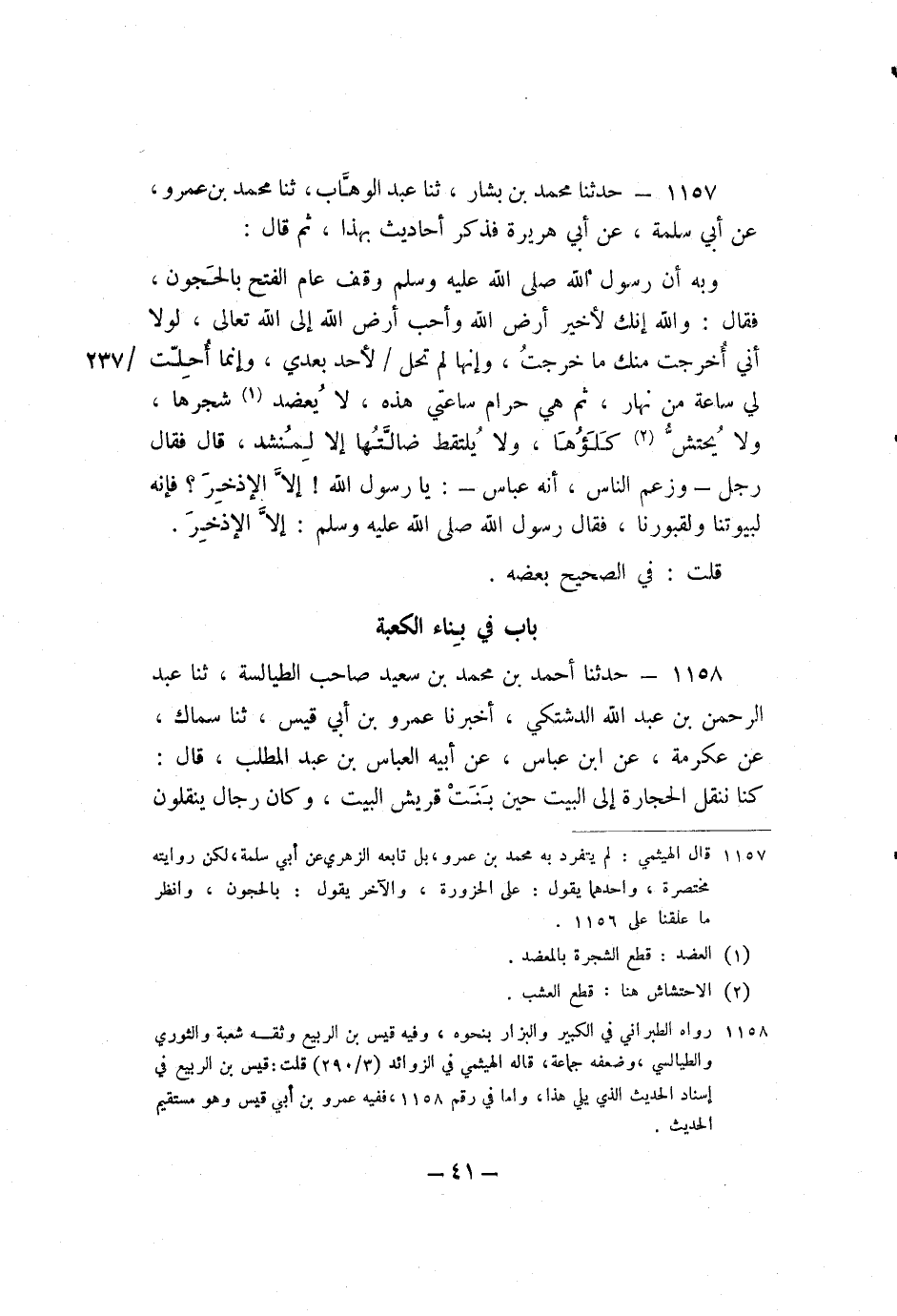 1157 - حَدَّثَنَا مُحَمَّدُ بْنُ بَشَّارٍ، ثنا عَبْدُ الْوَهَّابِ، ثنا مُحَمَّدُ بْنُ عَمْرٍو، عَنْ أَبِي سَلَمَةَ، عَنْ أَبِي هُرَيْرَةَ، فَذَكَرَ أَحَادِيثَ بِهَذَا، ثُمَّ قَالَ: وَبِهِ أَنَّ رَسُولَ اللَّهِ صَلَّى اللَّهُ عَلَيْهِ وَسَلَّمَ وَقَفَ عَامَ الْفَتْحِ بِالْحَجُونِ، فَقَالَ: «وَاللَّهِ إِنَّكِ لأَخْيَرُ أَرْضِ اللَّهِ وَأَحَبُّ أَرْضِ اللَّهِ إِلَى اللَّهِ تَعَالَى، لَوْلا أَنِّي أُخْرِجْتُ مِنْكِ مَا خَرَجْتُ، وَإِنَّهَا لَمْ تَحِلَّ لأَحَدٍ بَعْدِي، وَإِنَّمَا أُحِلَّتْ لِي سَاعَةٌ مِنْ نَهَارٍ، ثُمَّ هِيَ حَرَامٌ سَاعَتِي هَذِهِ، لا يُعْضَدُ شَجَرُهَا، وَلا يُحْتَشُّ كَلَؤُهَا، وَلا يُلْتَقَطُ ضَالَّتُهَا إِلا لِمُنْشِدٍ» ، قَالَ: فَقَالَ رَجُلٌ، وَزَعَمَ النَّاسُ أَنَّهُ عَبَّاسٌ: يَا رَسُولَ اللَّهِ، إِلا الإِذْخَرَ؟ فَإِنَّهُ لِبُيَوتِنَا وَلِقُبُورِنَا، فَقَالَ رَسُولُ اللَّهِ صَلَّى اللَّهُ عَلَيْهِ وَسَلَّمَ: «إِلَّا الإِذْخَرَ» .