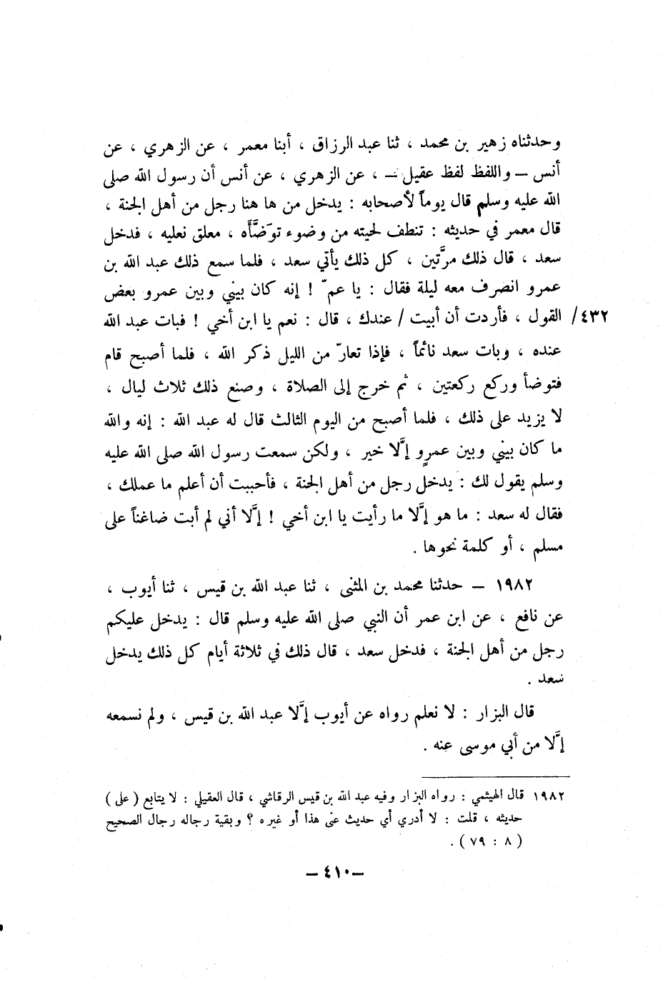1982 - حَدَّثَنَا مُحَمَّدُ بْنُ الْمُثَنَّى، ثنا عَبْدُ اللَّهِ بْنُ قَيْسٍ، ثنا أَيُّوبُ، عَنْ نَافِعٍ، عَنِ ابْنِ عُمَرَ أَنَّ النَّبِيَّ صَلَّى اللَّهُ عَلَيْهِ وَسَلَّمَ قَالَ: «يَدْخُلُ عَلَيْكُمْ رَجُلٌ مِنْ أَهْلِ الْجَنَّةِ، فَدَخَلَ سَعْدٌ، قَالَ ذَلِكَ فِي ثَلاثَةِ أَيَّامٍ كُلُّ ذَلِكَ يَدْخُلُ سَعْدٍ» .
