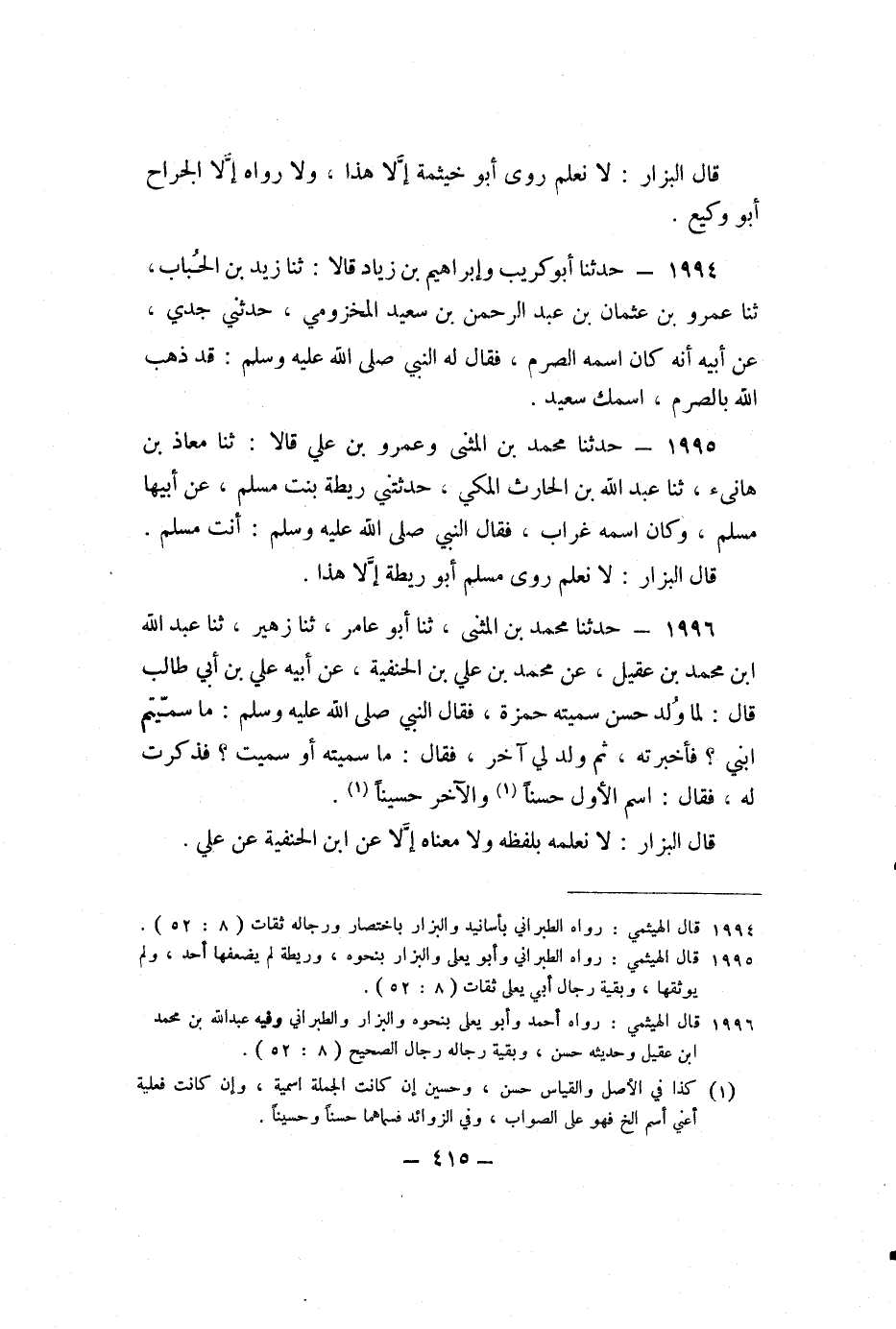 1996 - حَدَّثَنَا مُحَمَّدُ بْنُ الْمُثَنَّى، ثنا أَبُو عَامِرٍ، ثنا زُهَيْرٌ، ثنا عَبْدُ اللَّهِ بْنُ مُحَمَّدِ بْنِ عُقَيْلٍ، عَنْ مُحَمَّدِ بْنِ عَلِيِّ بْنِ الْحَنَفِيَّةِ، عَنْ أَبِيَهِ عَلِيِّ بْنِ أَبِي طَالِبٍ، قَالَ: لَمَّا وُلِدَ حَسَنٌ سَمَّيْتُهُ حَمْزَةَ، فَقَالَ النَّبِيُّ صَلَّى اللَّهُ عَلَيْهِ وَسَلَّمَ: " مَا سَمَّيْتُمُ ابْنِي؟ فَأَخْبَرْتُهُ، ثُمَّ وُلِدَ لِي آخَرُ، فَقَالَ: مَا سَمَّيْتَهُ أَوْ سَمَّيْتَ؟ فَذَكَرْتُ لَهُ، فَقَالَ: اسْمُ الأَوَّلِ حَسَنٌ وَالآخَرِ حُسَيْنٌ ".