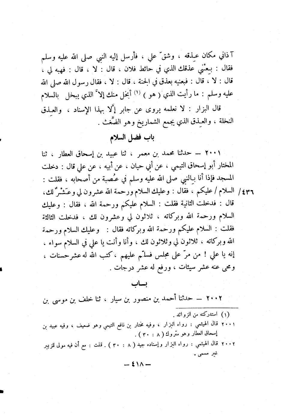2001 - حَدَّثَنَا مُحَمَّدُ بْنُ مَعْمَرٍ، ثنا عُبَيْدُ بْنُ إِسْحَاقَ الْعَطَّارُ، ثنا الْمُخْتَارُ أَبُو إِسْحَاقَ التَّيْمِيُّ، عَنْ أَبِي حَيَّانَ، عَنْ أَبِيهِ، عَنْ عَلِيٍّ، قَالَ: " دَخَلْتُ الْمَسْجِدَ فَإِذَا أَنَا بِالنَّبِيِّ صَلَّى اللَّهُ عَلَيْهِ وَسَلَّمَ فِي عُصْبَةٍ مِنْ أَصْحَابِهِ، فَقُلْتُ: السَّلامُ عَلَيْكُمْ، فَقَالَ: وَعَلَيْكُمُ السَّلامُ وَرَحْمَةُ اللَّهِ عِشْرُونَ لِي وَعَشْرٌ لَكَ، قَالَ: فَدَخَلْتُ الثَّانِيَةَ فَقُلْتُ: السَّلامُ عَلَيْكُمْ وَرَحْمَةُ اللَّهِ، فَقَالَ: وَعَلَيْكَ السَّلامُ وَرَحْمَةُ اللَّهِ وَبَرَكَاتُهُ، ثَلاثُونَ لِي وَعِشْرُونَ لَكَ، فَدَخَلْتُ الثَّالِثَةَ فَقُلْتُ: السَّلامُ عَلَيْكُمْ وَرَحْمَةُ اللَّهِ وَبَرَكَاتُهُ، فَقَالَ: وَعَلْيَك السَّلامُ وَرَحْمَةُ اللَّهِ وَبَرَكَاتُهُ، ثَلاثُونَ وَثَلاثُونَ لَكَ، وَأَنَا وَأَنْتَ يَا عَلِيُّ فِي السَّلامِ سَوَاءٌ، إِنَّهُ يَا عَلِيُّ، مَنْ مَرَّ عَلَى مَجْلِسٍ فَسَلَّمَ عَلَيْهِمْ، كَتَبَ اللَّهُ لَهُ عَشْرَ حَسَنَاتٍ، وَمَحَا عَنْهُ عَشْرَ سَيِّئَاتٍ، وَرَفَعَ لَهُ عَشْرَ دَرَجَاتٍ ".