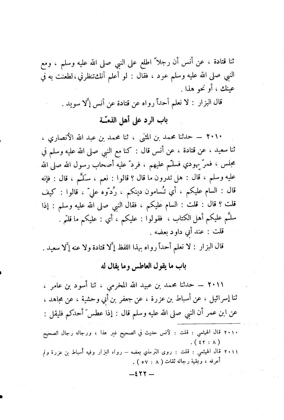 2010 - حَدَّثَنَا مُحَمَّدُ بْنُ الْمُثَنَّى، ثنا مُحَمَّدُ بْنُ عَبْدِ اللَّهِ الأَنْصَارِيُّ، ثنا سَعِيدٌ، عَنْ قَتَادَةَ، عَنْ أَنَسٍ، قَالَ: كُنَّا مَعَ النَّبِيِّ صَلَّى اللَّهُ عَلَيْهِ وَسَلَّمَ فِي مَجْلِسٍ، فَمَرَّ يَهُودِيٌّ فَسَلَّمَ عَلَيْهِمْ، فَرَدَّ عَلَيْهِ أَصْحَابُ رَسُولِ اللَّهِ صَلَّى اللَّهُ عَلَيْهِ وَسَلَّمَ، قَالَ: «هَلْ تَدْرُونَ مَا قَالَ؟» قَالُوا: نَعَمْ، سَلَّمَ، قَالَ: " فَإِنَّهُ قَالَ: السَّامُ عَلَيْكُمْ، أَيْ: تُسَامُونَ دِينَكُمْ، رُدُّوهُ عَلَيَّ "، قَالُوا: كَيْفَ قُلْتَ؟ قَالَ: قُلْتُ: السَّامُ عَلَيْكُمْ، فَقَالَ النَّبِيُّ صَلَّى اللَّهُ عَلَيْهِ وَسَلَّمَ: " إِذَا سَلَّمَ عَلَيْكُمْ أَهْلُ الْكِتَابِ، فَقُولُوا: عَلَيْكُمْ، أَيْ: عَلَيْكُمْ مَا قُلْتُمْ ".
