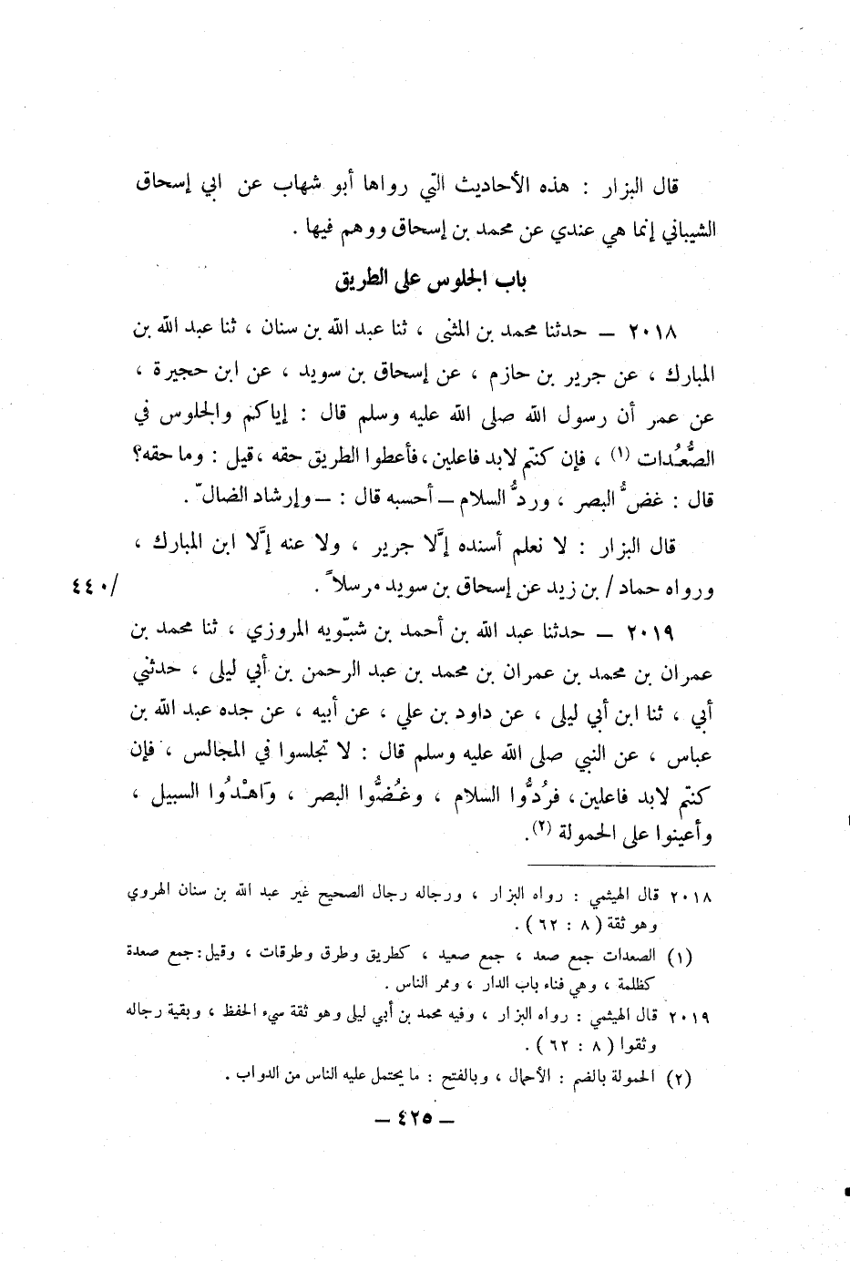 2018 - حَدَّثَنَا مُحَمَّدُ بْنُ الْمُثَنَّى، ثنا عَبْدُ اللَّهِ بْنُ سِنَانٍ، ثنا عَبْدُ اللَّهِ بْنُ الْمُبَارَكِ، عَنْ جَرِيرِ بْنِ حَازِمٍ، عَنْ إِسْحَاقَ بْنِ سُوَيْدٍ، عَنِ ابْنِ حُجَيْرَةَ، عَنْ عُمَرَ أَنَّ رَسُولَ اللَّهِ صَلَّى اللَّهُ عَلَيْهِ وَسَلَّمَ قَالَ: " إِيَّاكُمْ وَالْجُلُوسَ فِي الصُّعُدَاتِ، فَإِنْ كُنْتُمْ لا بُدَّ فَاعِلِينَ، فَأَعْطُوا الطَّرِيقَ حَقَّهُ، قِيلَ: وَمَا حَقُّهُ؟ قَالَ: غَضُّ الْبَصَرِ، وَرَدُّ السَّلامِ، أَحْسِبُهُ قَالَ: وَإِرْشَادُ الضَّالِ ".