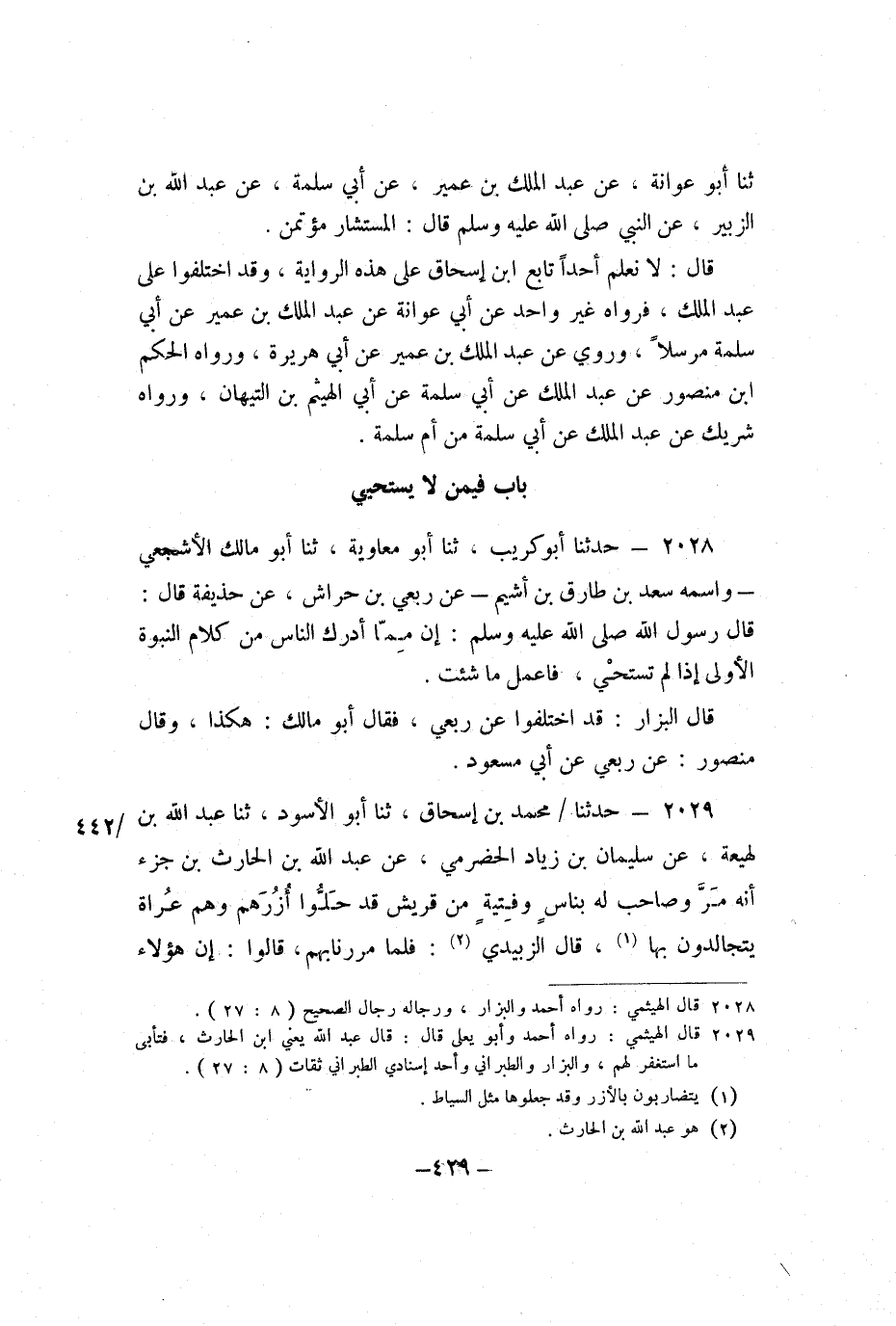 قَالَ الْبَزَّارُ: قَدِ اخْتَلَفُوا عَنْ رِبْعِيٍّ، فَقَالَ أَبُو مَالِكٍ: هَكَذَا، وَقَالَ مَنْصُورٌ: عَنْ رِبْعِيٍّ، عَنِ أَبِي مَسْعُودٍ.