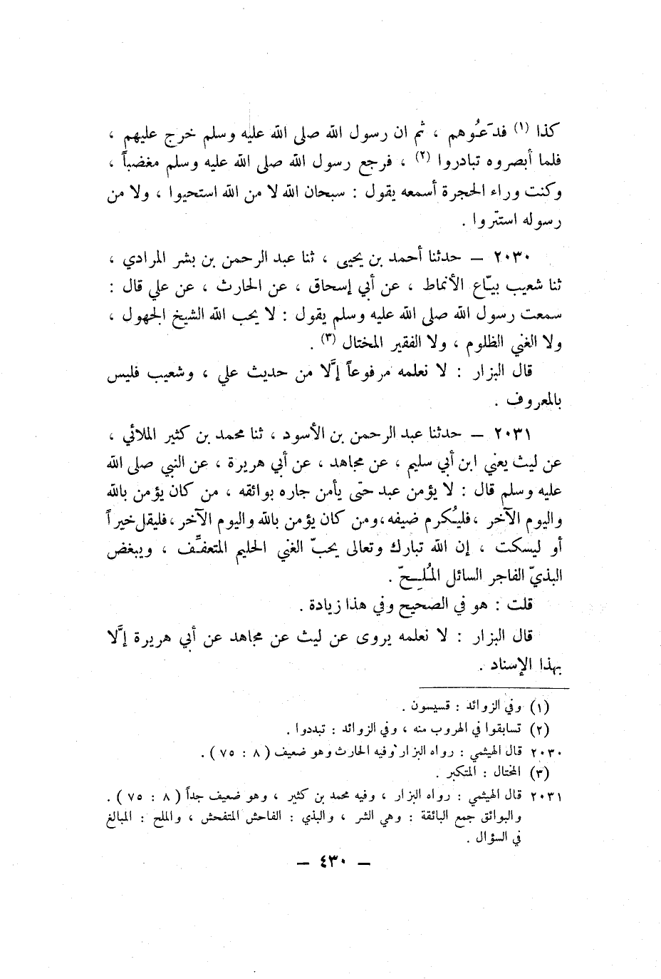 2031 - حَدَّثَنَا عَبْدُ الرَّحْمَنِ بْنُ الأَسْوَدِ، ثنا مُحَمَّدُ بْنُ كَثِيرٍ الْمُلائِيُّ، عَنْ لَيْثٍ، يَعْنِي: ابْنَ أَبِي سُلَيْمٍ، عَنْ مُجَاهِدٍ، عَنْ أَبِي هُرَيْرَةَ، عَنِ النَّبِيِّ صَلَّى اللَّهُ عَلَيْهِ وَسَلَّمَ، قَالَ: «لا يُؤْمِنُ عَبْدٌ حَتَّى يَأْمَنَ جَارُهُ بَوَائِقَهُ، مَنْ كَانَ يُؤْمِنُ بِاللَّهِ وَالْيَوْمِ الآخِرِ، فَلْيُكْرِمْ ضَيْفَهُ، وَمَنْ كَانَ يُؤْمِنُ بِاللَّهِ وَالْيَوْمِ الآخِرِ، فَلْيَقُلْ خَيْرًا أَوْ لِيَسْكُتْ، إِنَّ اللَّهَ تَبَارَكَ وَتَعَالَى يُحِبُّ الْغَنِيَّ الْحَلِيمَ الْمُتَعَفِّفَ، وَيُبْغِضُ الْبَذِيَّ الْفَاجِرَ السَّائِلَ الْمُلِحَّ» .