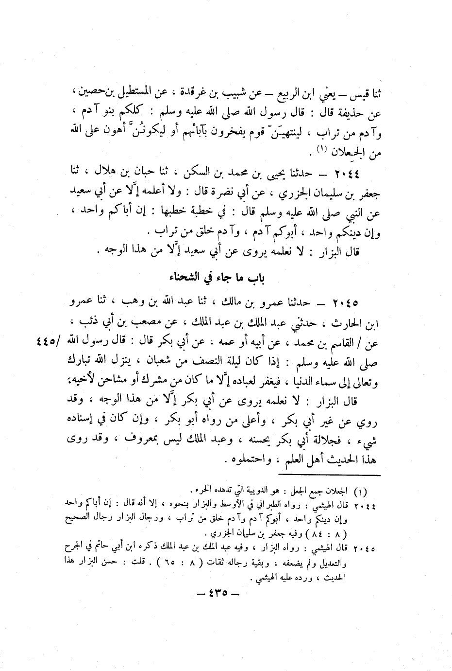 2045 - حَدَّثَنَا عَمْرُو بْنُ مَالِكٍ، ثنا عَبْدُ اللَّهِ بْنُ وَهْبٍ، ثنا عَمْرُو بْنُ الْحَارِثِ، حَدَّثَنِي عَبْدُ الْمَلِكِ بْنُ عَبْدِ الْمَلِكِ، عَنْ مُصْعَبِ بْنِ أَبِي ذِئْبٍ، عَنِ الْقَاسِم بْنِ مُحَمَّدٍ، عَنْ أَبِيهِ، أَوْ عَمِّهِ، عَنْ أَبِي بَكْرٍ، قَالَ: قَالَ رَسُولُ اللَّهِ صَلَّى اللَّهُ عَلَيْهِ وَسَلَّمَ: «إِذَا كَانَ لَيْلَةُ النِّصْفِ مِنْ شَعْبَانَ، يَنْزِلُ اللَّهُ تَبَارَكَ وَتَعَالَى إِلَى سَمَاءِ الدُّنْيَا، فَيَغْفِرُ لِعِبَادِهِ إِلا مَا كَانَ مِنْ مُشْرِكٍ أَوْ مُشَاحِنٍ لأَخِيهِ» .