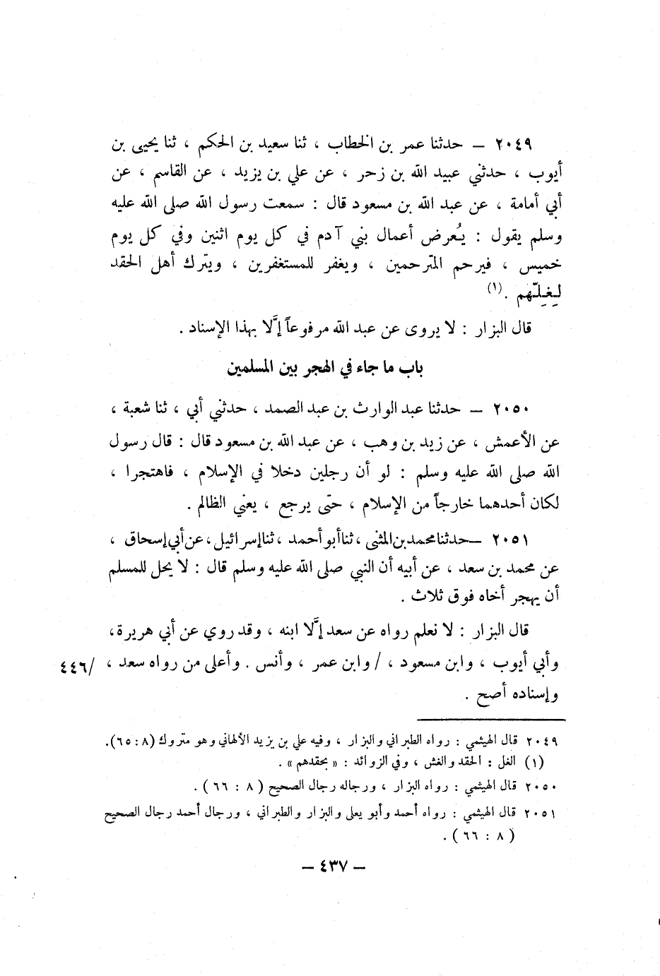 2049 - حَدَّثَنَا عُمَرُ بْنُ الْخَطَّابِ، ثنا سَعِيدُ بْنُ الْحَكَمِ، ثنا يَحْيَى بْنُ أَيُّوبَ، حَدَّثَنِي عُبَيْدُ اللَّهِ بْنُ زُحْرٍ، عَنْ عَلِيِّ بْنِ يَزِيدَ، عَنِ الْقَاسِمِ، عَنْ أَبِي أُمَامَةَ، عَنْ عَبْدِ اللَّهِ بْنِ مَسْعُودٍ، قَالَ: سَمِعْتُ رَسُولَ اللَّهِ صَلَّى اللَّهُ عَلَيْهِ وَسَلَّمَ يَقُولُ: «يُعْرَضُ أَعْمَالُ بَنِي آدَمَ فِي كُلِّ يَوْمِ اثْنَيْنِ وَفِي كُلِّ يَوْمِ خَمِيسٍ، فَيَرْحَمُ الْمُتَرَحِّمِينَ، وَيَغْفِرُ لِلْمُسْتَغْفِرِينَ، وَيَتْرُكُ أَهْلَ الْحِقْدِ لِغِلِّهِمْ» .