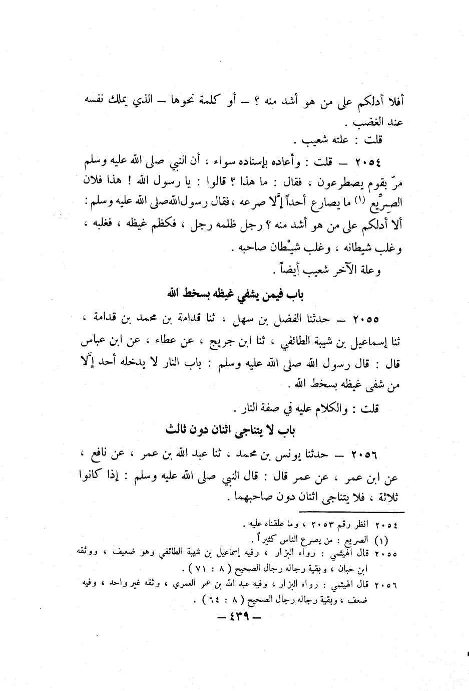 2054 - قُلْتُ: وَأَعَادَهُ بِإِسْنَادِهِ سَوَاءٍ، أَنَّ النَّبِيَّ صَلَّى اللَّهُ عَلَيْهِ وَسَلَّمَ مَرَّ بِقَوْمٍ يَصْطَرِعُونَ، فَقَالَ: «مَا هَذَا؟» قَالُوا: يَا رَسُولَ اللَّهِ، هَذَا فُلانٌ الصَّرِيعُ مَا يُصَارِعُ أَحَدًا إِلا صَرَعَهُ، فَقَالَ رَسُولُ اللَّهِ صَلَّى اللَّهُ عَلَيْهِ وَسَلَّمَ: «أَلَا أَدُلُّكُمْ عَلَى مَنْ هُوَ أَشَدُّ مِنْهُ؟ رَجُلٌ ظَلَمَهُ رَجُلٌ، فَكَظَمَ غَيْظَهُ، فَغَلَبَهُ، وَغَلَبَ شَيْطَانَهُ، وَغَلَبَ شَيْطَانَ صَاحِبِهِ» .