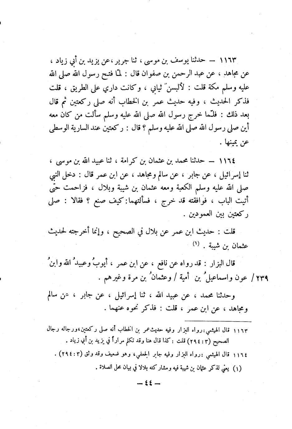 1164 - حَدَّثَنَا مُحَمَّدُ بْنُ عُثْمَانَ بْنِ كَرَامَةَ، ثنا عُبَيْدُ اللَّهِ بْنُ مُوسَى، ثنا إِسْرَائِيلُ، عَنْ جَابِرٍ، عَنْ سَالِمٍ، وَمُجَاهِدٍ، عَنِ ابْنِ عُمَرَ، قَالَ: دَخَلَ النَّبِيُّ صَلَّى اللَّهُ عَلَيْهِ وَسَلَّمَ الْكَعْبَةَ وَمَعَهُ عُثْمَانُ بْنُ شَيْبَةَ , وَبِلالٌ، فَزَاحَمْتُ حَتَّى أَتَيْتُ الْبَابَ، فَوَافَقْتُهُ قَدْ خَرَجَ، فَسَأَلْتُهُمَا: كَيْفَ صَنَعَ؟ فَقَالا: صَلَّى رَكْعَتَيْنِ بَيْنَ الْعَمُودَيْنِ.