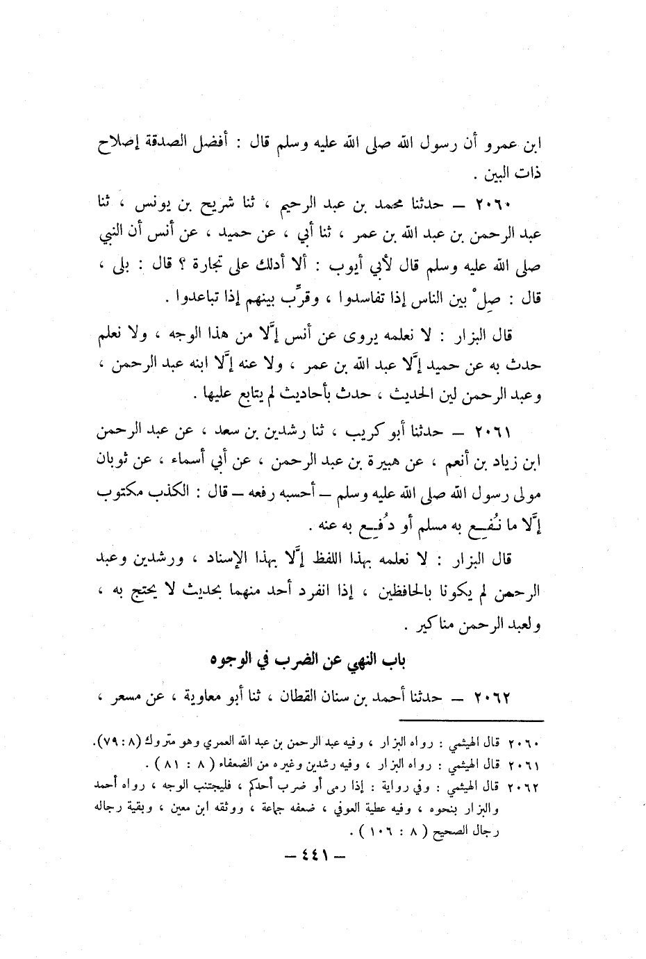 قَالَ الْبَزَّارُ: لا نَعْلَمُهُ بِهَذَا اللَّفْظِ إِلا بِهَذَا الإِسْنَادِ، وَرِشْدِينُ وَعَبْدُ الرَّحْمَنِ لَمْ يَكُونَا بِالْحَافِظَيْنِ، إِذَا انْفَرَدَ أَحَدٌ مِنْهُمَا بِحَدِيثٍ لا يُحْتَجُّ بِهِ، وَلِعَبْدِ الرَّحْمَنِ مَنَاكِيرُ.